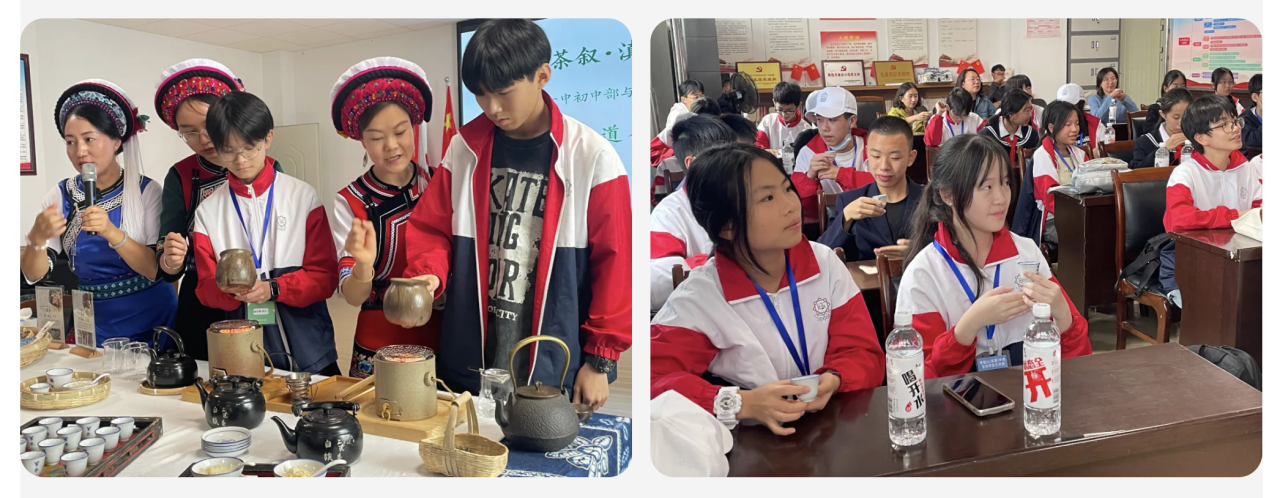 午後的陽光透過窗戶灑在活動場地上,溫暖而柔和。在「青春茶敘•滇港少年非遺對話」的大理三道茶文化體驗活動中,大家圍坐在一起,探尋著大理古老的茶文化。茶俗(白族三道茶)省級代表傳承人董麗老師生動的敘述,讓香港師生們對三道茶的歷史淵源、文化內涵和製作工藝有了深入的了解。當第一道「苦茶」入口,那略帶苦澀的味道彷彿在訴說著生活中的艱辛;第二道「甜茶」帶來的甜蜜,又讓人感受到生活的美好;而第三道「回味茶」的獨特風味,則讓人回味無窮。滇港兩地的少年們在這茶香中,共同品味著生活,交流彼此對文化的理解與感悟。