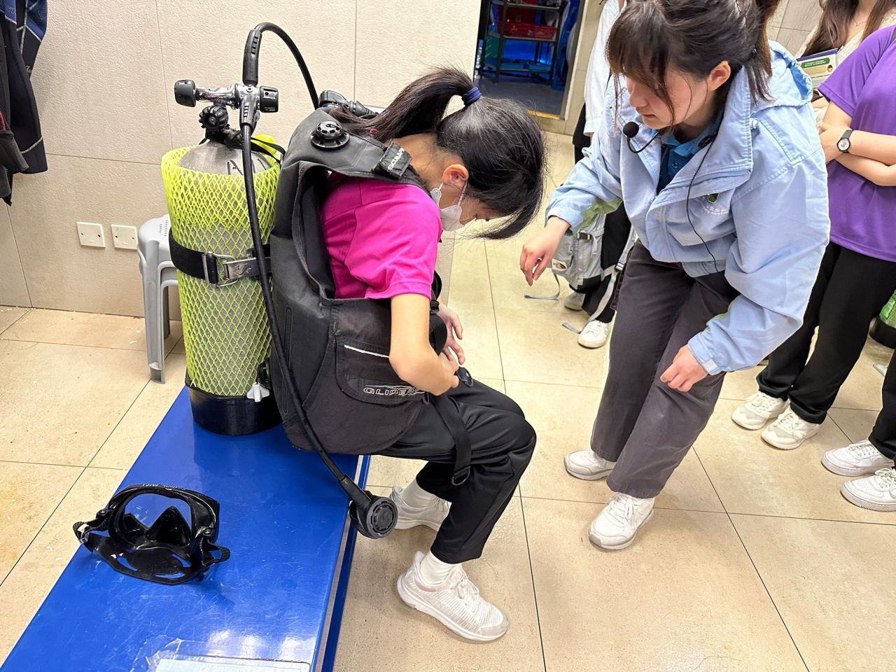 Students tried on oxygen tanks used by aquarium keepers during their work.