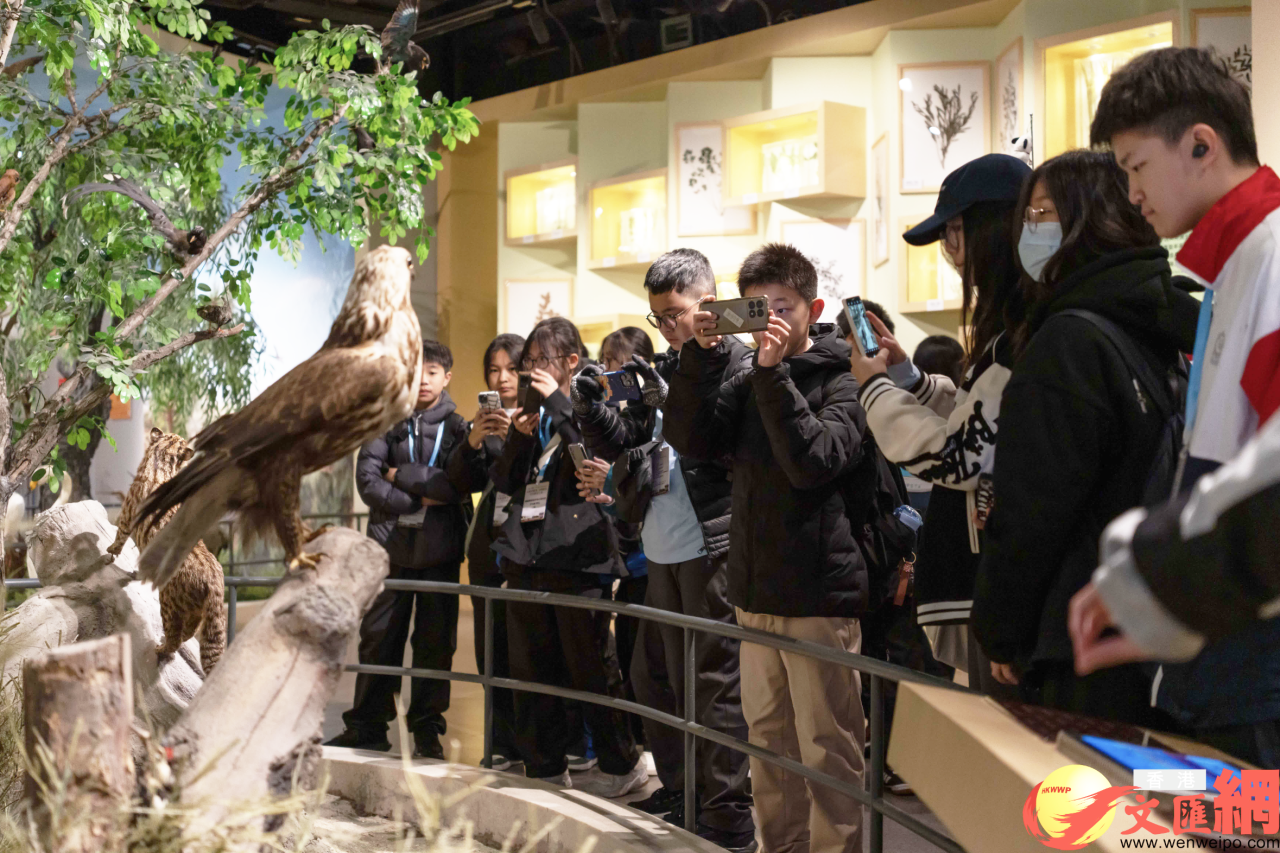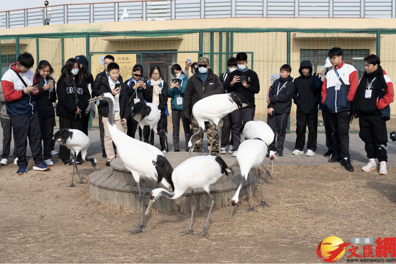 在黃河口鳥類科普樂園,飼養着一批保護區救助的丹頂鶴,每天會舉行多場放飛活動。隨着工作人員的一聲哨響,丹頂鶴走出鳥舍振翅高飛,隨後圍繞放飛場飛行一周平穩落地,引得香港學生們陣陣歡呼。在觀看放飛表演和近距離觀看丹頂鶴進食後,港大同學會書院林永譽感覺非常新奇,跟他在博物館裏看到的標本完全不一樣。
