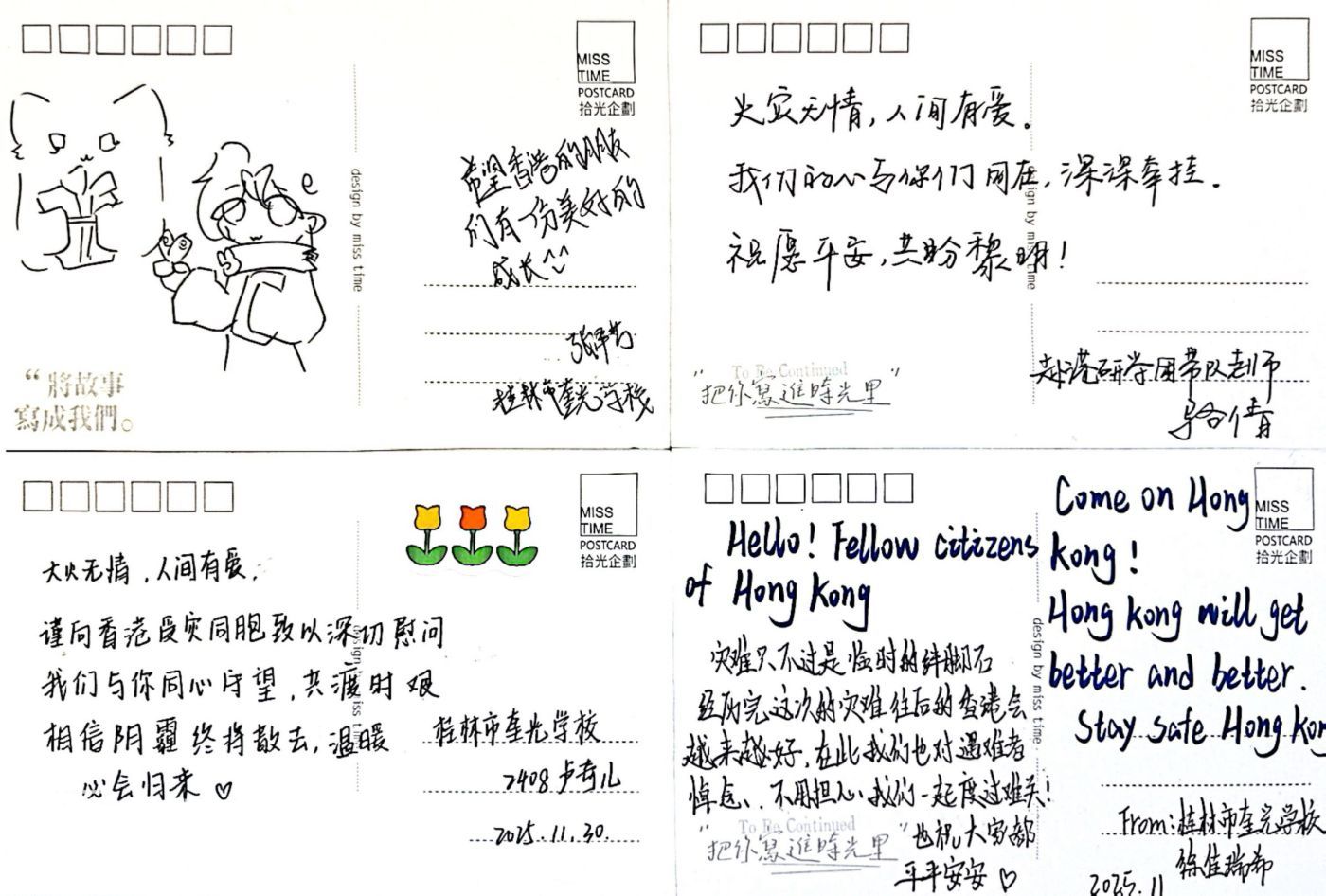 近日,大埔發生了一宗嚴重的火災事故,不僅對當地居民造成了重大損失,也牽動了我們每一位香港市民的心。在這段艱難時刻,我們收到來自內地姊妹學校的慰問與關懷,讓我們深受感動。他們特地寄來一批充滿溫情的慰問卡,字裡行間充滿了對我們的支持、鼓勵與祝福。