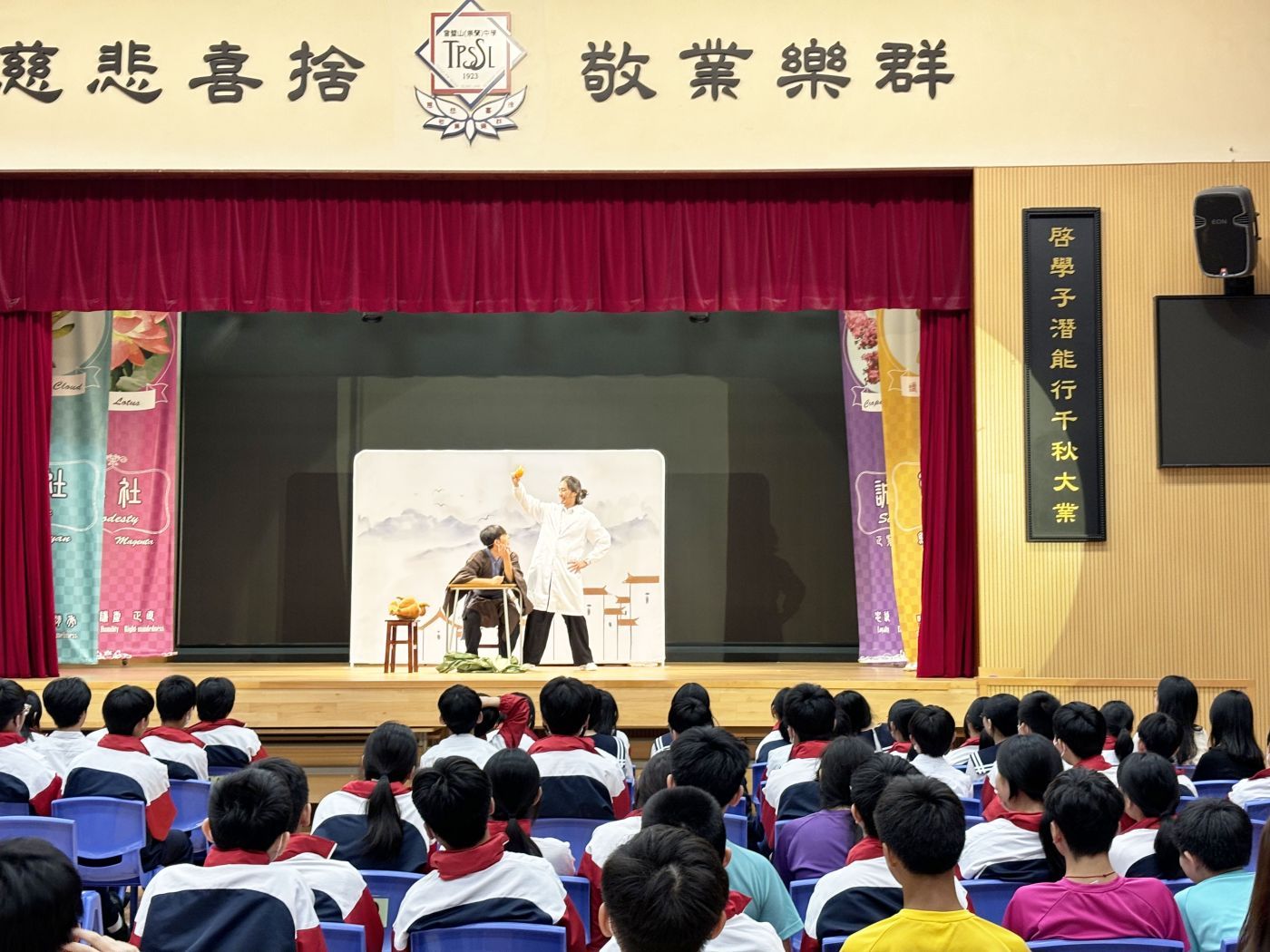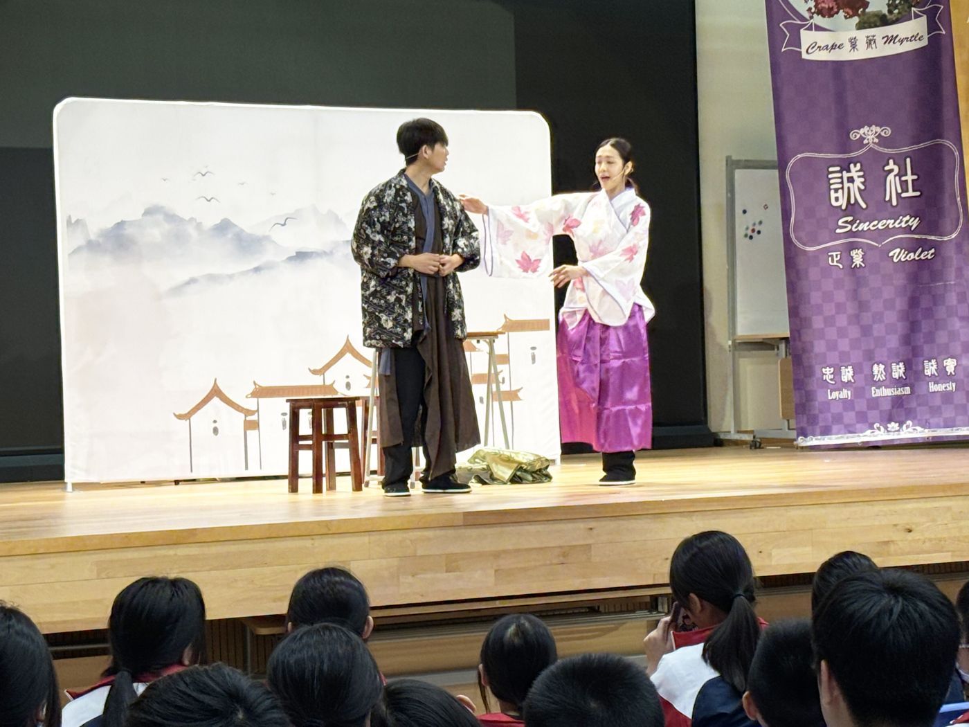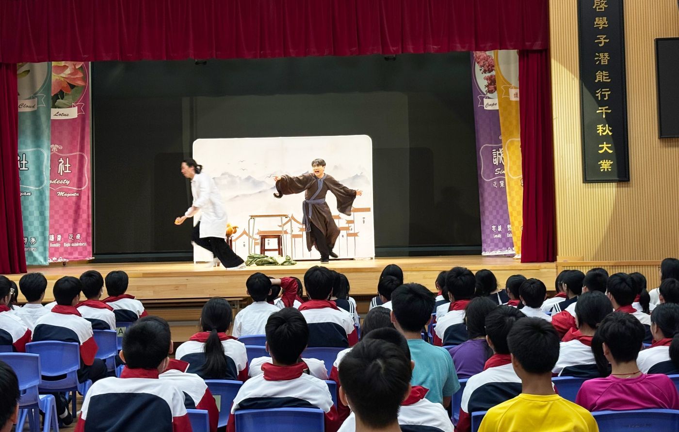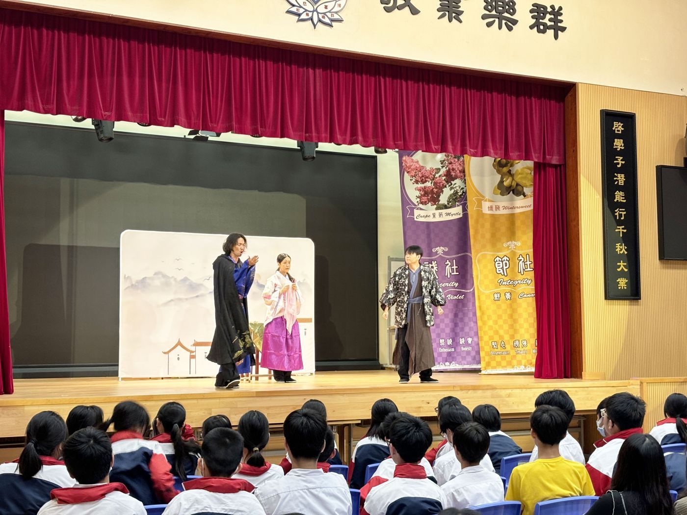 《蘆衣順母》是二十四孝中其中一個故事, 主人翁閔子騫遭受繼母虐待,寒冬中只能穿著蘆花填充的單薄冬衣。父親發現後憤怒欲休妻,但閔子騫卻跪求原諒,說出「母在一子寒,母去三子單」的感人話語。演出令同學思考,如何以寬容之心面對家庭不公、孝順的真正意義是什麼,並從演出中感受戲劇的魅力。