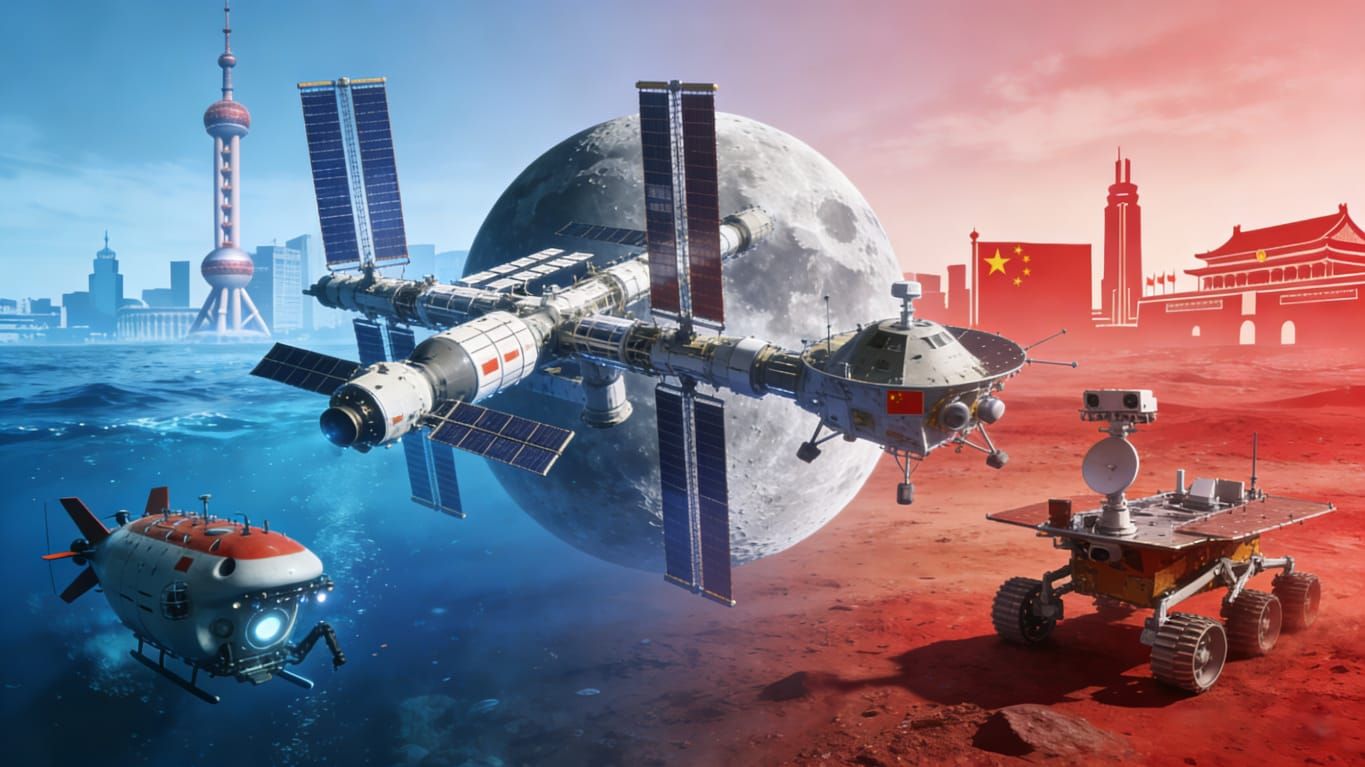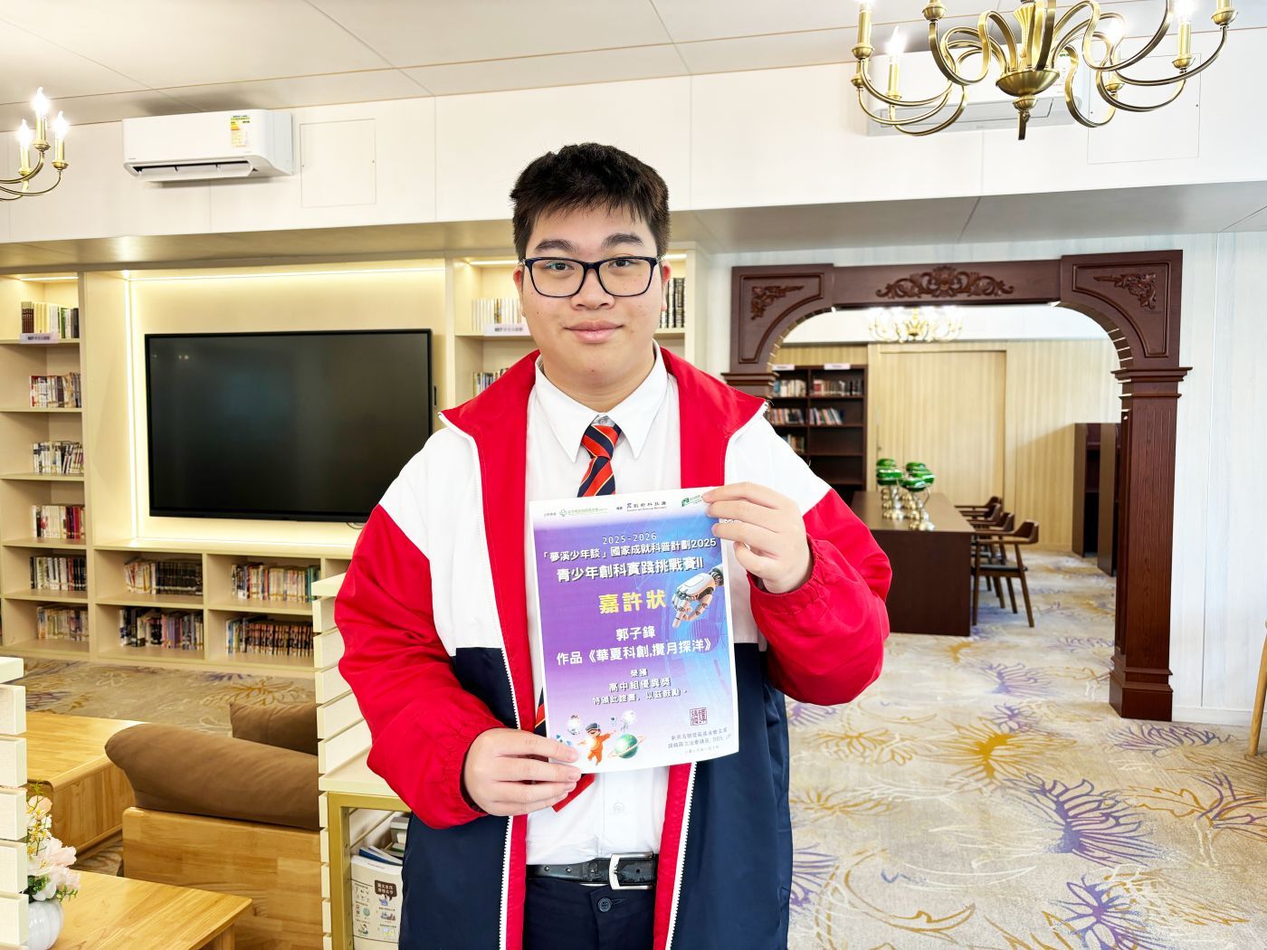 6A郭子鋒同學以生成式人工智能設計圖片,顯示中國在科技方面取得的巨大成就。作品「華夏科創·攬月探洋」獲高中組優異獎,更於科學園公開展出!