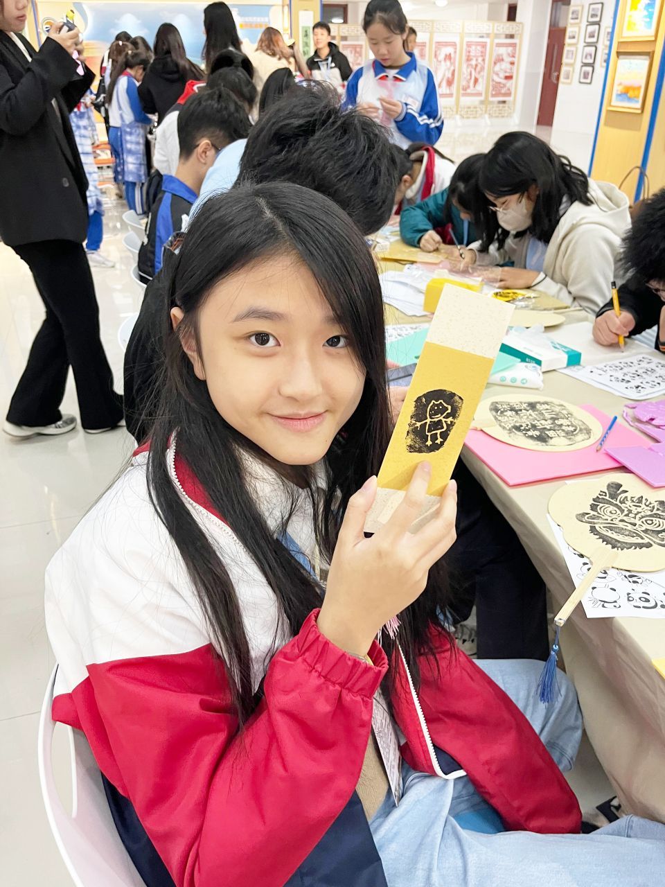 3B班陳家樂同學於東營區黃河中學參與剪紙體驗課時與其學校學生交流。