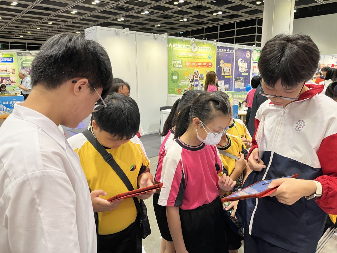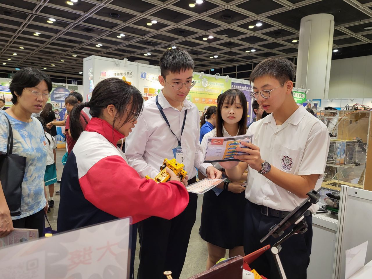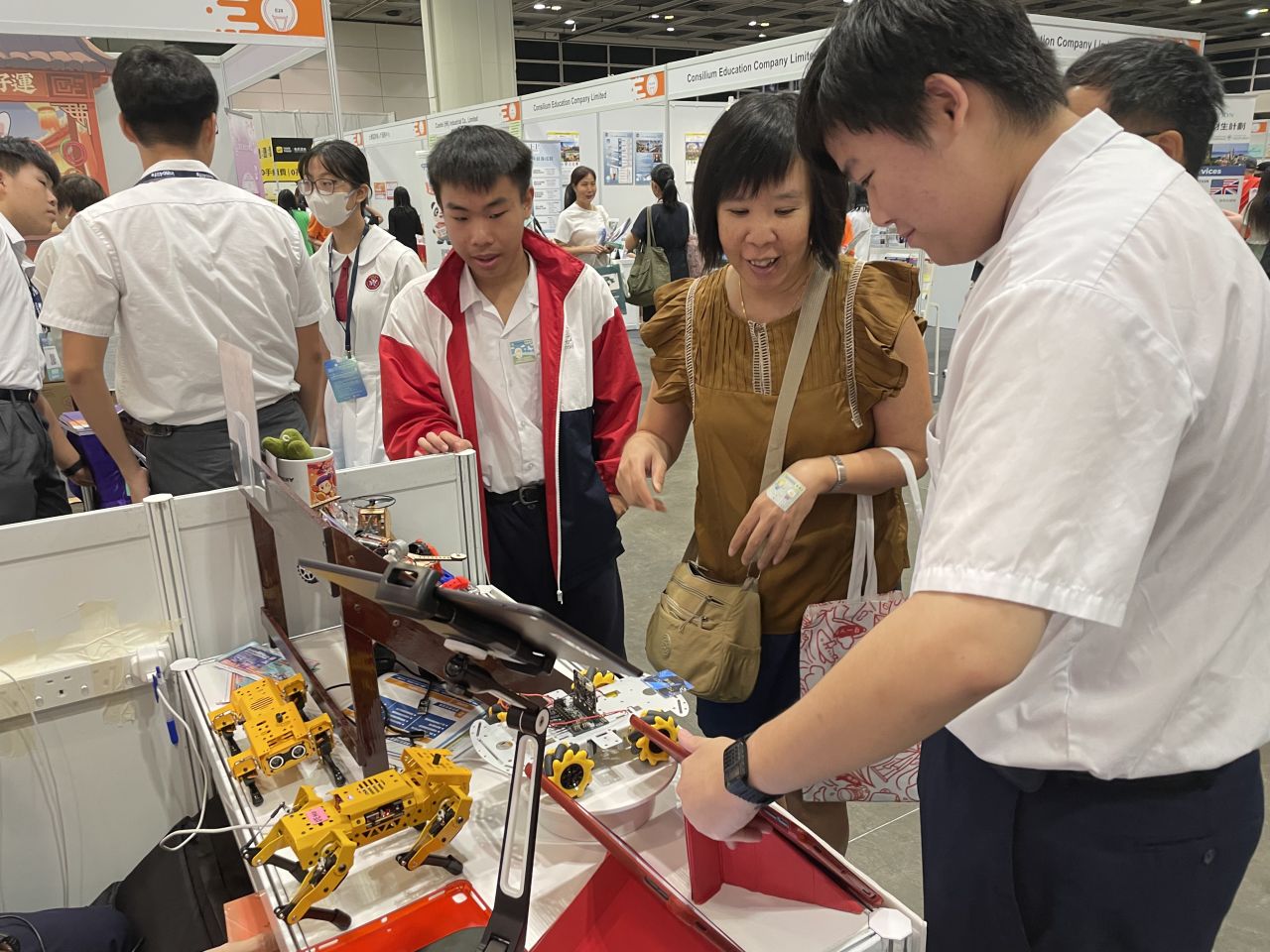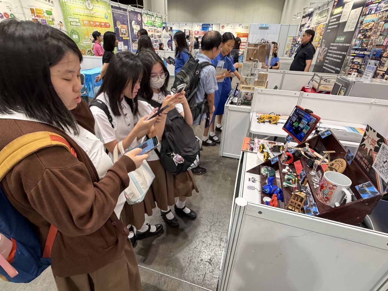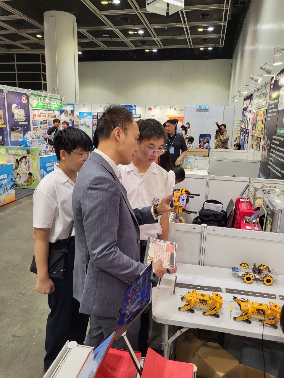 現場反應熱烈,本校攤位吸引眾多來賓到訪,包括家長、中小學生、大專院校教師及科創企業代表。來賓不僅深入了解本校STEAM教學方案,更積極參與問答遊戲,並體驗近距離與機械狗互動的樂趣。