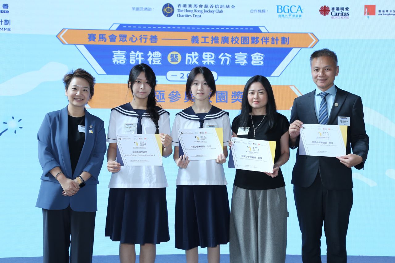 今年,我校參與由香港賽馬會慈善信託基金舉辦的「賽馬會眾心行善—義工推廣校園夥伴計劃」,與全港共261間學校一同推廣義工文化,並獲認證為「善幸校園」。在眾多學校之中,我校更榮獲「積極參與校園獎」,而全港只有12間中學取得此殊榮,足見同學們的熱情與投入。