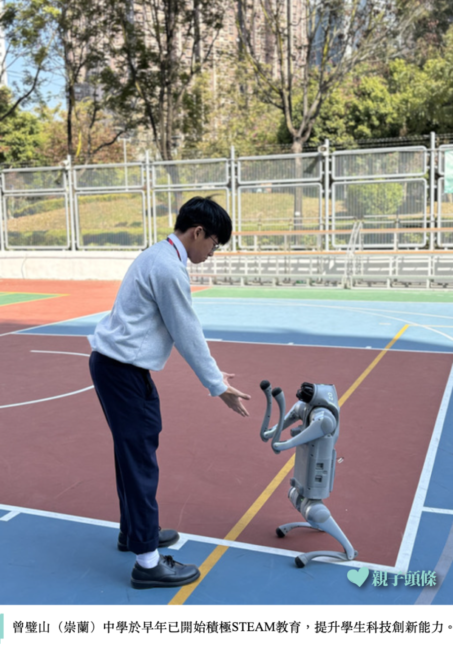 教育界近年積極提倡教育,曾璧山(崇蘭)中學於早年已有推行經驗,展現前瞻視野。早前學校斥資二十萬港元引入多隻機械狗,其中一款最新型號價值十三萬港元,目前為全港學界獨有。這些配備模型的機械狗,不僅能完成特定任務,更支持二次開發,讓學生在「看得見、摸得到」的實踐中學習人工智能技術。為培養學生的邏輯思維與實務能力,該校的電腦科設普及與進階課程,教授從小型機械狗操作到大型機械狗任務開發;為強化學生的設計思維與解難能力,學校為初中同學開設的「工程科學科」近年讓學生通過專題研習動手解決真實的生活或社會問題。例如,設計人體紅外線節能系統,解決課室浪費冷氣的問題;針對駕駛者容易疲勞眼睏的痛點,設計出能通過鏡頭辨識疲勞狀態,並即時發出提醒的系統。