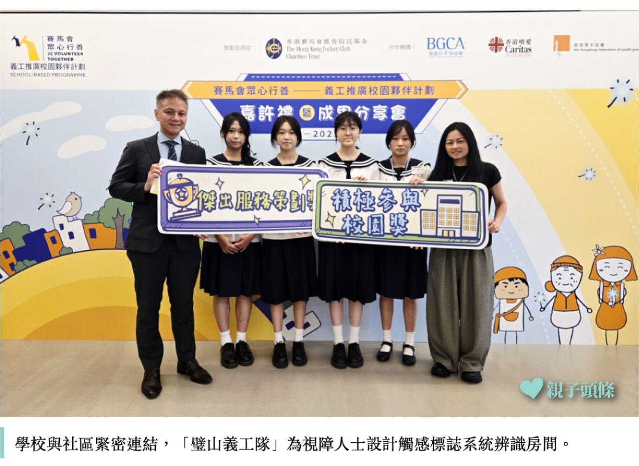 此外,學校與社區緊密連結,透過「璧山義工隊」、「沙田學生大使」、「扶輪少年服務團」等義工組織,帶領學生回饋社會。本年度,學校參與香港賽馬會慈善信託基金舉辦的「賽馬會眾心行善義工推廣校園夥伴計劃」獲認證為「善幸校園」,更榮獲「積極參與校園獎」。值得一提的是,「璧山義工隊」憑藉「觸感設計」獲得「傑出服務策劃獎優異獎」。這項專為視障人士設計的觸感標誌系統,不依賴盲文就能協助視障人士辨識房間,充分展現學生對社會弱勢群體的關懷與創新解決問題的能力。