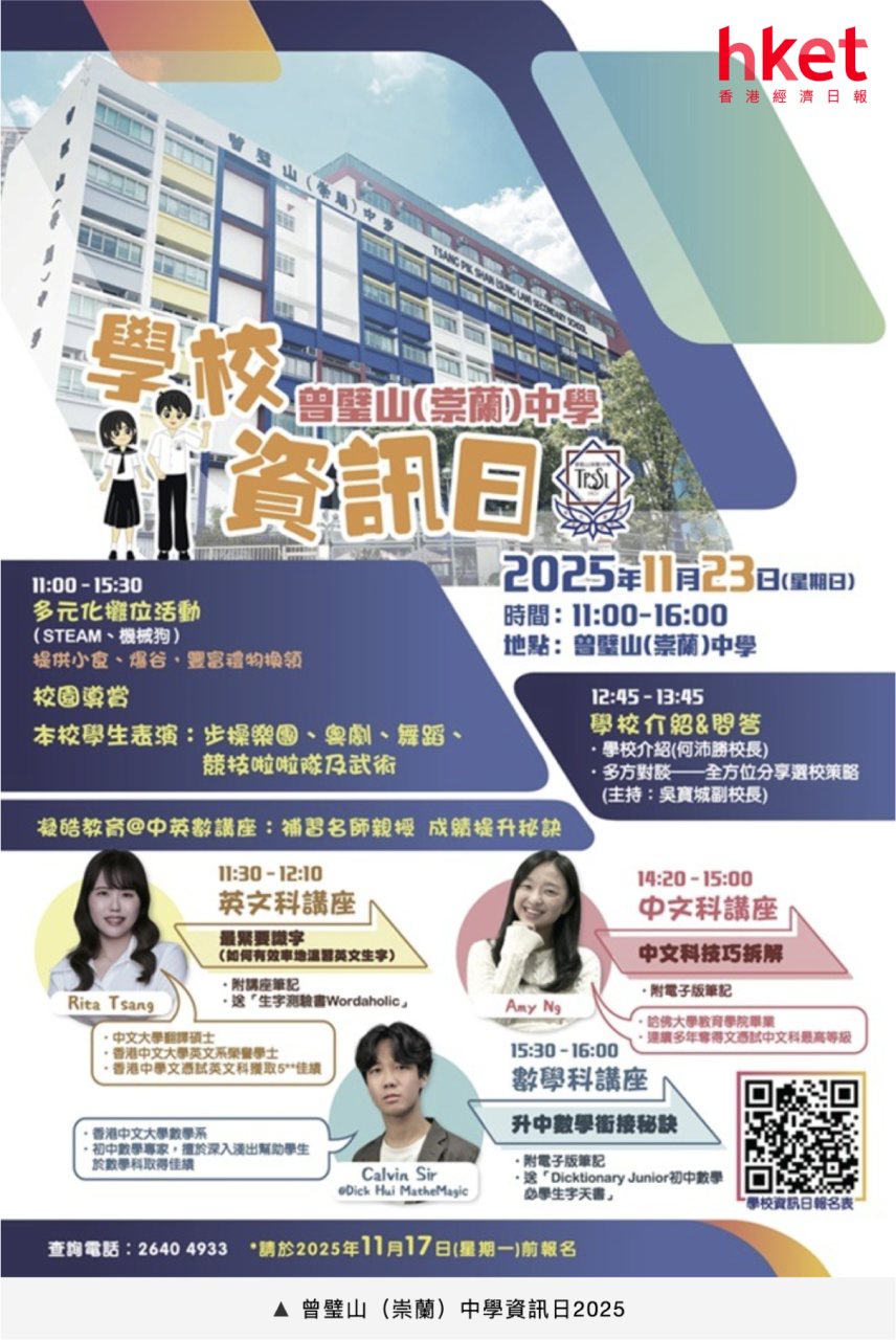 - 香港經濟日報——曾璧山(崇蘭)中學資訊日2025 全方位升學導航 × 名師中英數技巧傳授 × 互動校園體驗