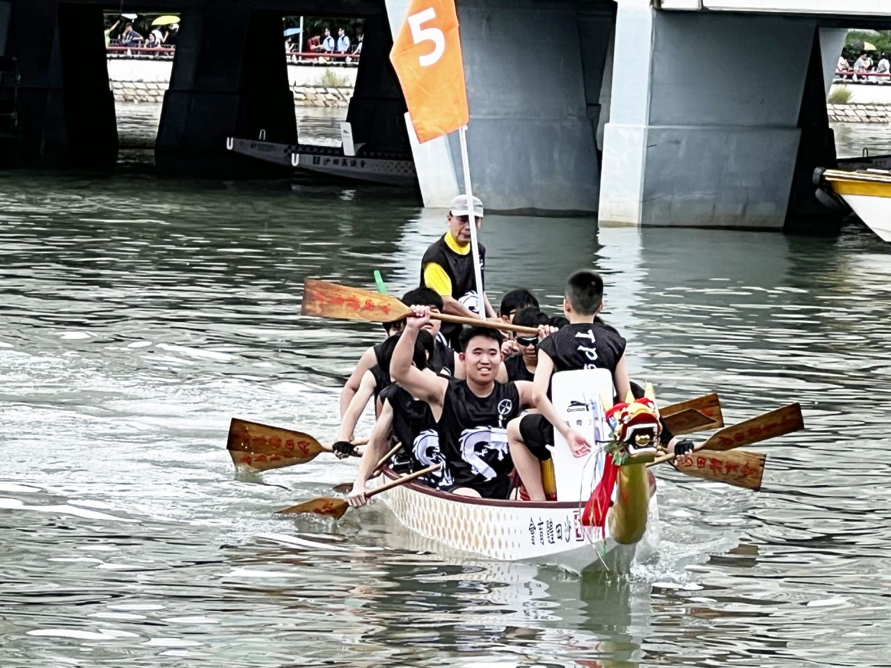 The victorious pose of our school's dragon boat team members after crossing the finish line