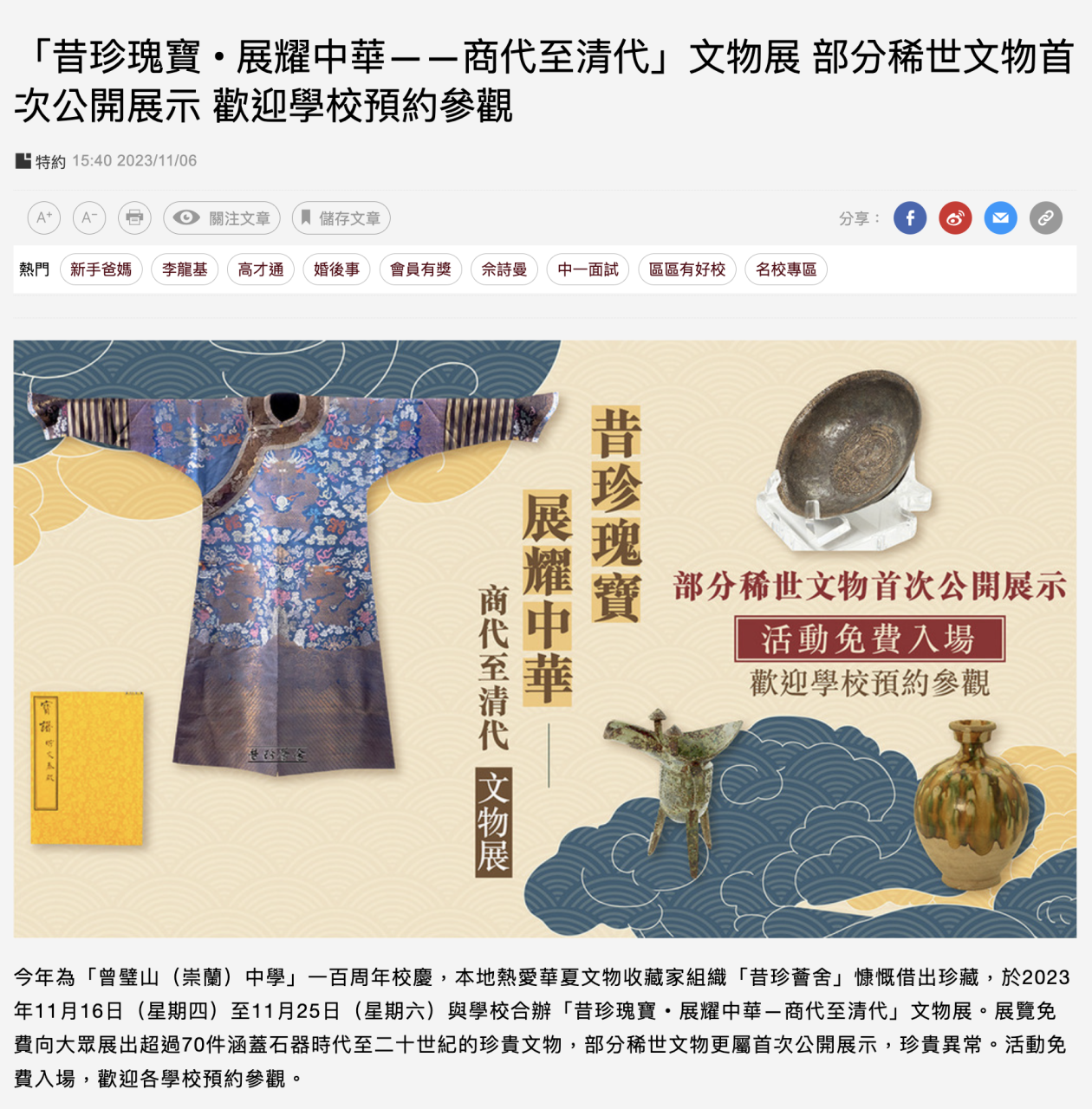 TOPick 香港經濟日報 - 「昔珍瑰寶 • 展耀中華——商代至清代」文物展 部分稀世文物首次公開展示 歡迎學校預約參觀