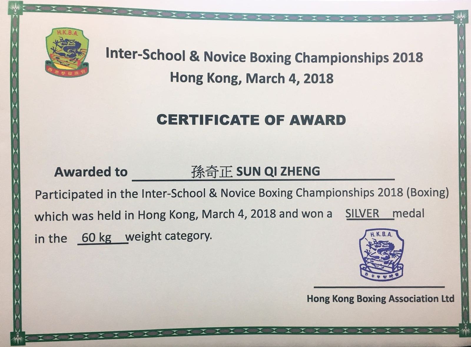 而本年「學界及新秀拳擊錦標賽2018」已於2018年3月4日完滿舉行,本校5A班孫奇正同學參與60公斤級別比賽,成績優異,榮獲亞軍殊榮。