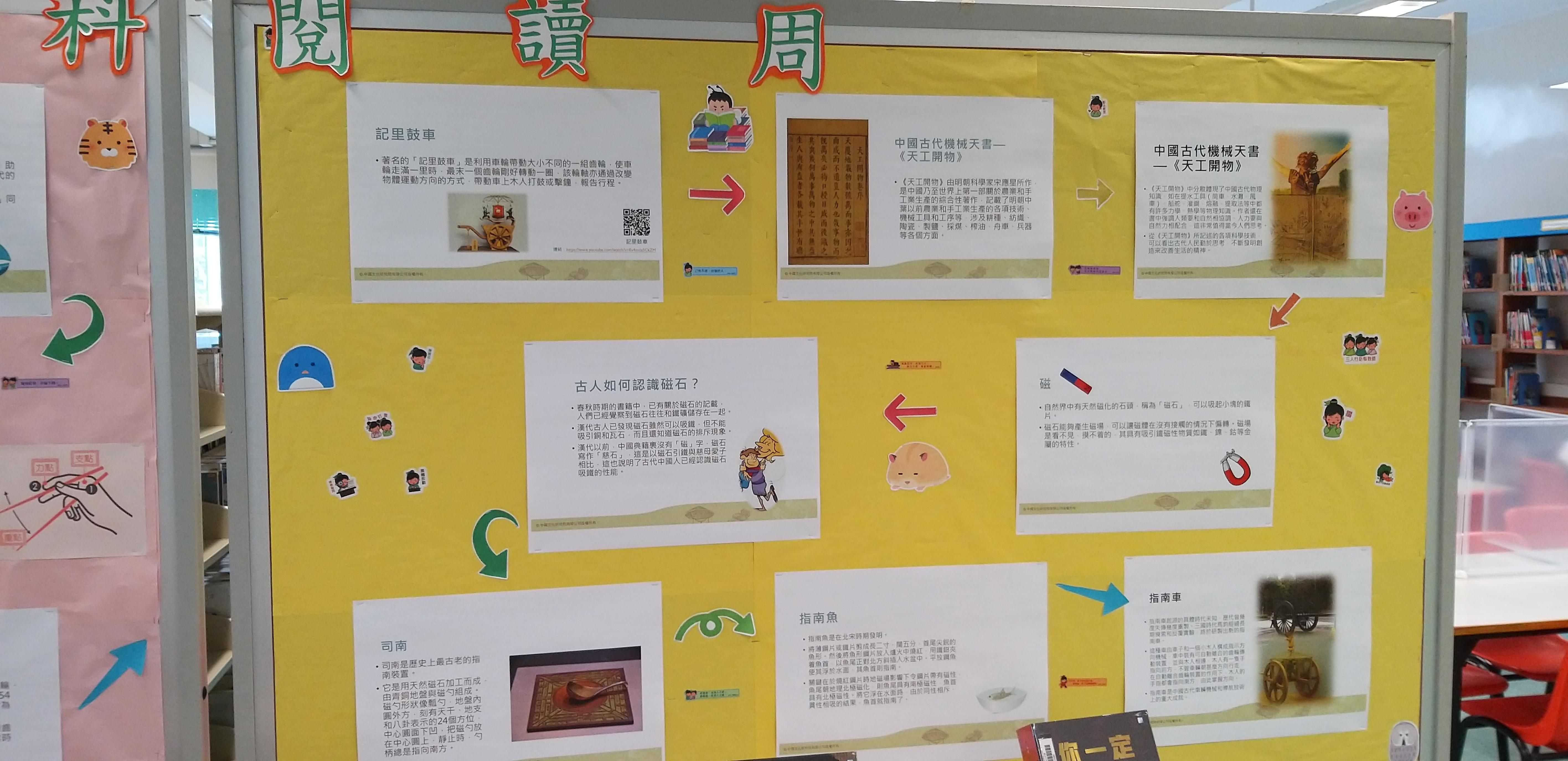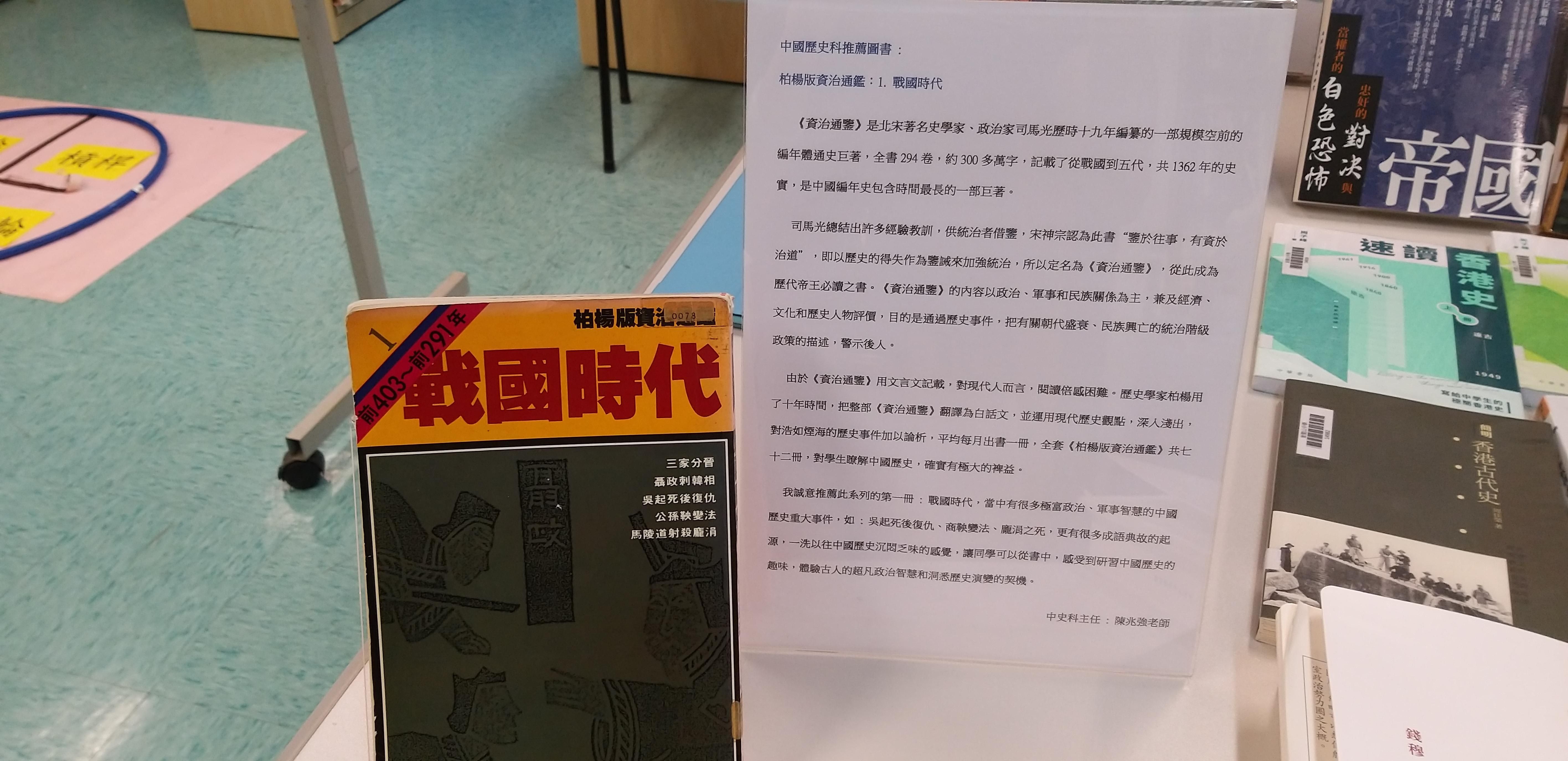 圖書館與中史科合辦閱讀周,於圖書館展出最新購買的中史圖書,亦設有展板介紹中國古代科學技術。學生在閱覽展板後參與攤位遊戲,換取獎品。同時,圖書館亦設有中史科模型展覽,學生可從模型中了解更多古人的生活面貌。圖書館亦邀請了中史科科主任陳兆強老師及圖書館領袖生作好書推薦,讓學生認識更多中史科圖書。