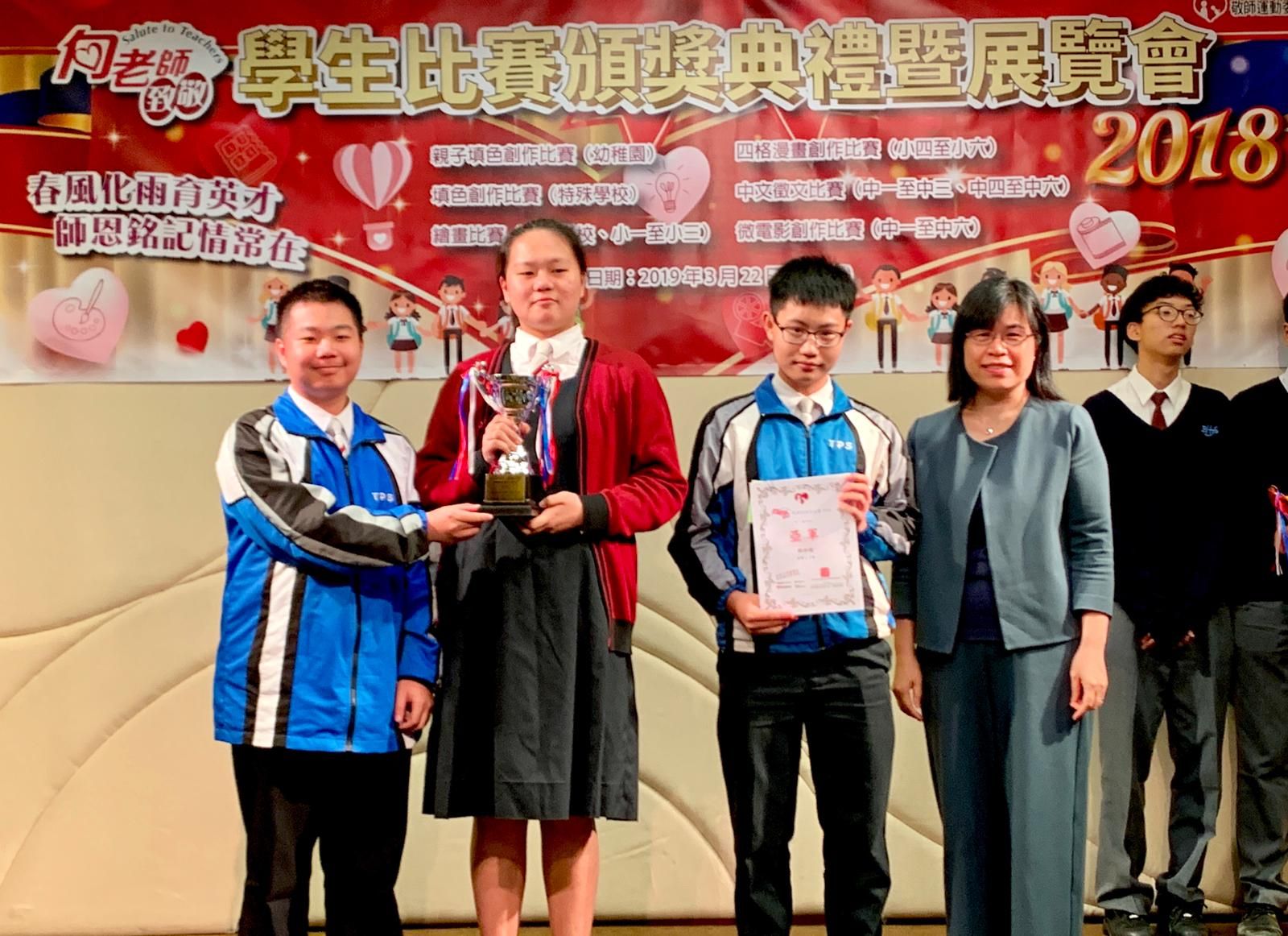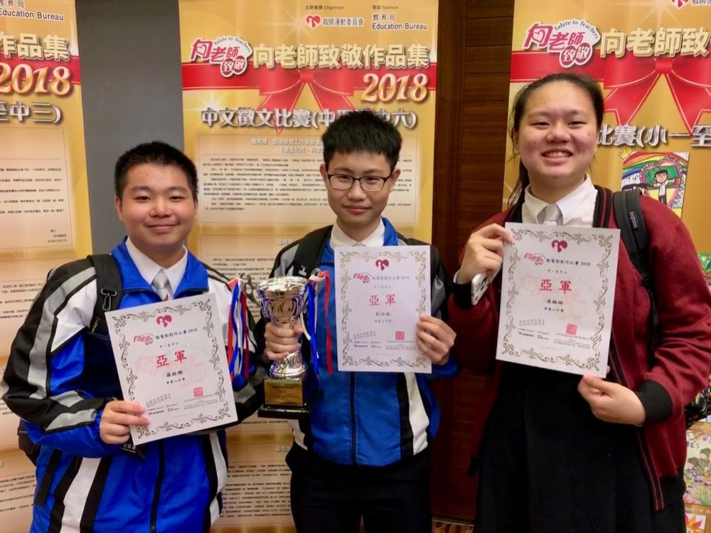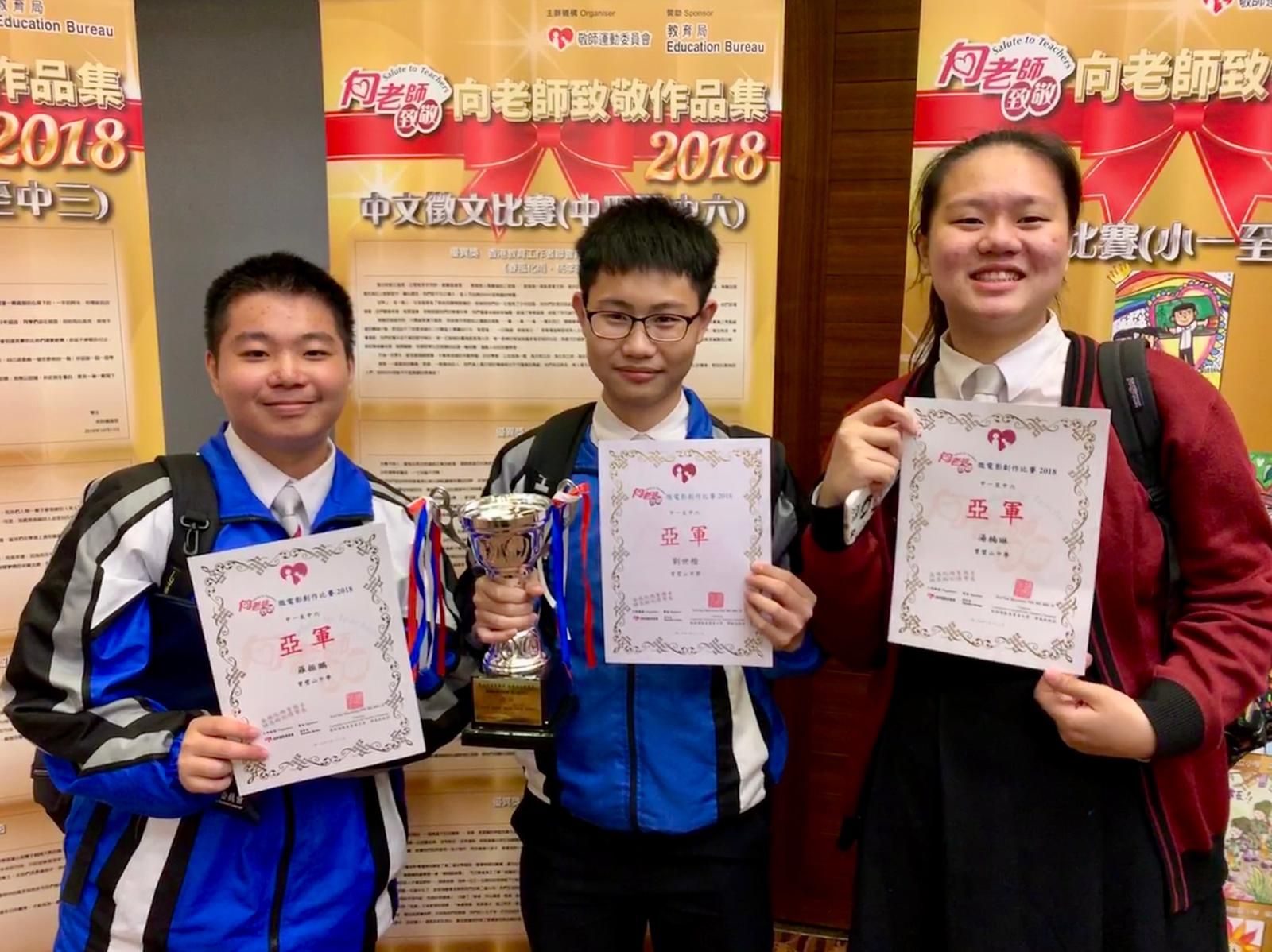 2019年3月22日,本校3B班 羅振鵬、劉世楷、湯楠琳、4B班 張嘉業、李凱俊,在2018 向老師致敬微電影創作比賽中獲得亞軍;典禮於城景國際酒店舉行,由教育局副局長蔡若蓮博士擔任主禮嘉賓。是次微電影拍攝感謝各位老師帶領及參與,包括黃佩楠老師、紀晴老師、Michael、楊庭暉老師、王香蘭老師、沈祖德老師、梁桂賢老師、梁嘉怡老師、鄭浩賢先生及競技啦啦隊。