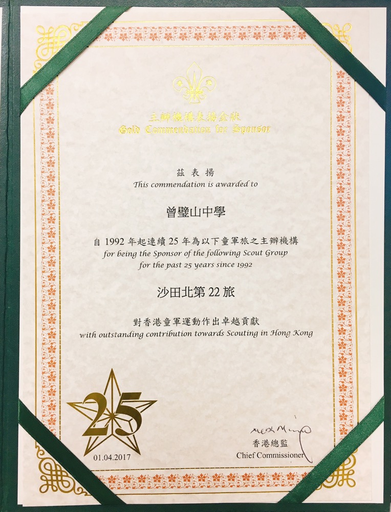 本校於2018年4月1日,獲得香港童軍總會主辨機構頒發的表揚金狀,對香港童軍運動作出卓越貢獻。
