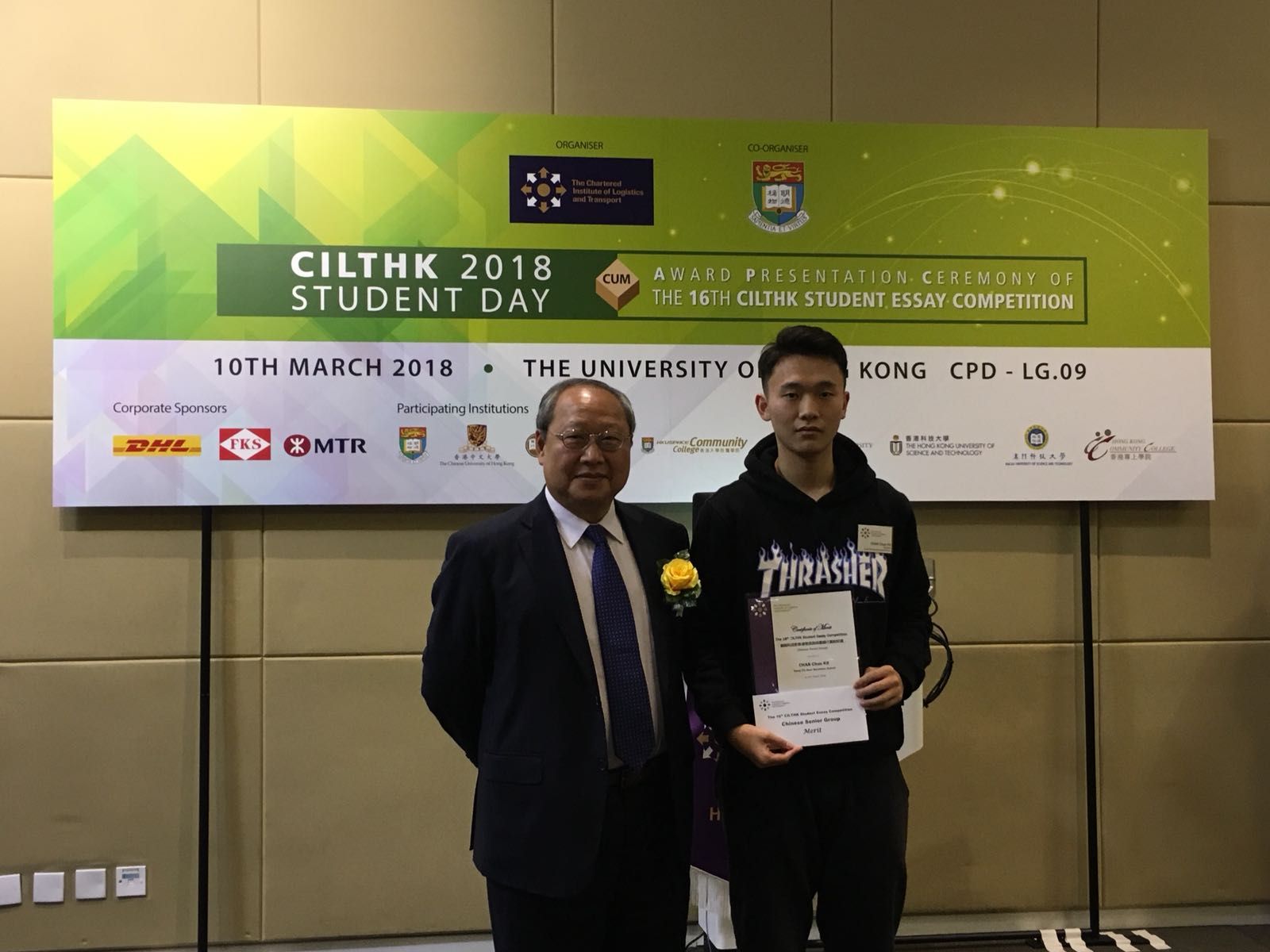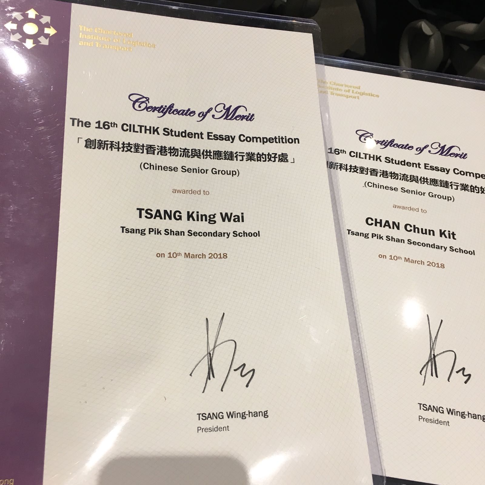 由香港運輸物流學會舉辦的「第十六屆中學生徵文比賽」,旨在讓學生發表對物流及運輸政策的創見,並鼓勵思考創意和分析能力。是次比賽由多所大學的工程學系教授作評判,在眾多作品中選出七份文章入選最後七強,本校5A陳川杰及曾敬威同學憑文章《創新科技對香港物流與供應鏈行業的好處》分列第四及第五,今天於香港大學獲取優異獎殊榮,為校增光。