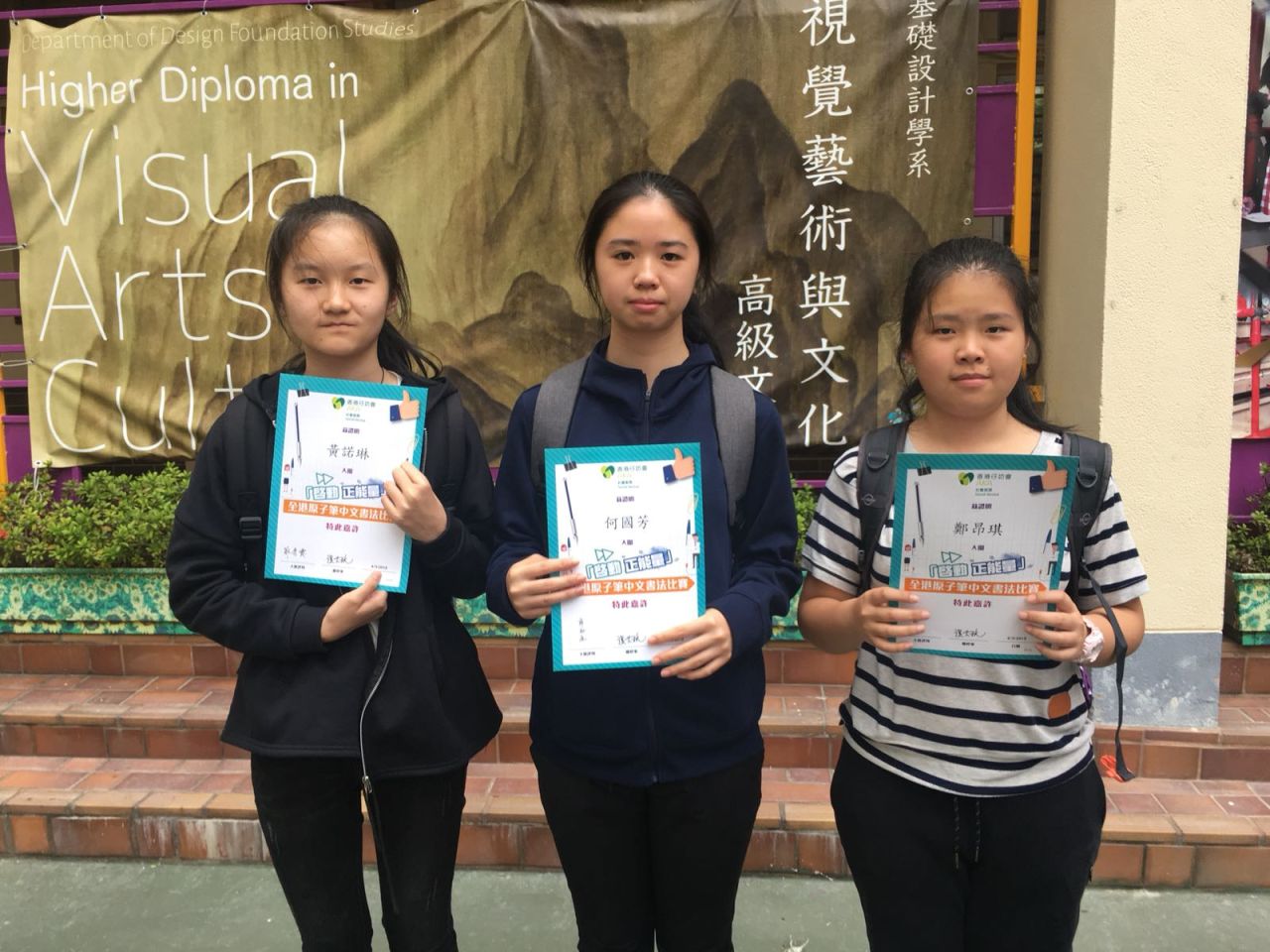 2018年3月4日,由香港仔坊會舉辦的第34屆「全港原子筆中文書法比賽」,今年主題為「啟動正能量」,鼓勵都市人積極面對生活,藉以學習正向文化。是次比賽吸引了86間小學、84間中學及39間機構,共25308人參與,最後選出600人參與今天現場即席揮毫的決賽。本校1A黃諾琳、4A鄭昂琪及4A何國芳同學,以端正秀麗的文字入選初中及高中決賽,並獲頒發證書。