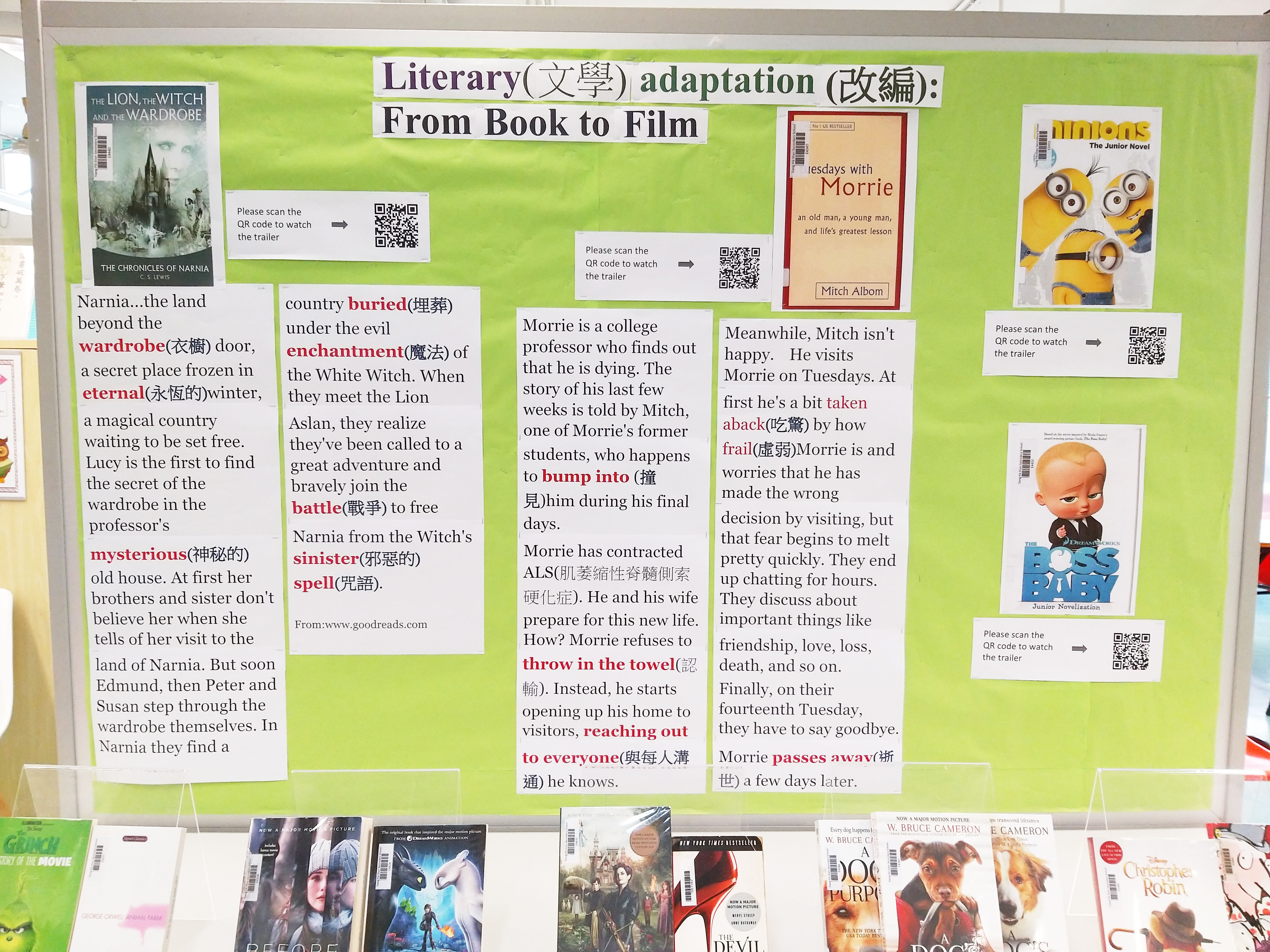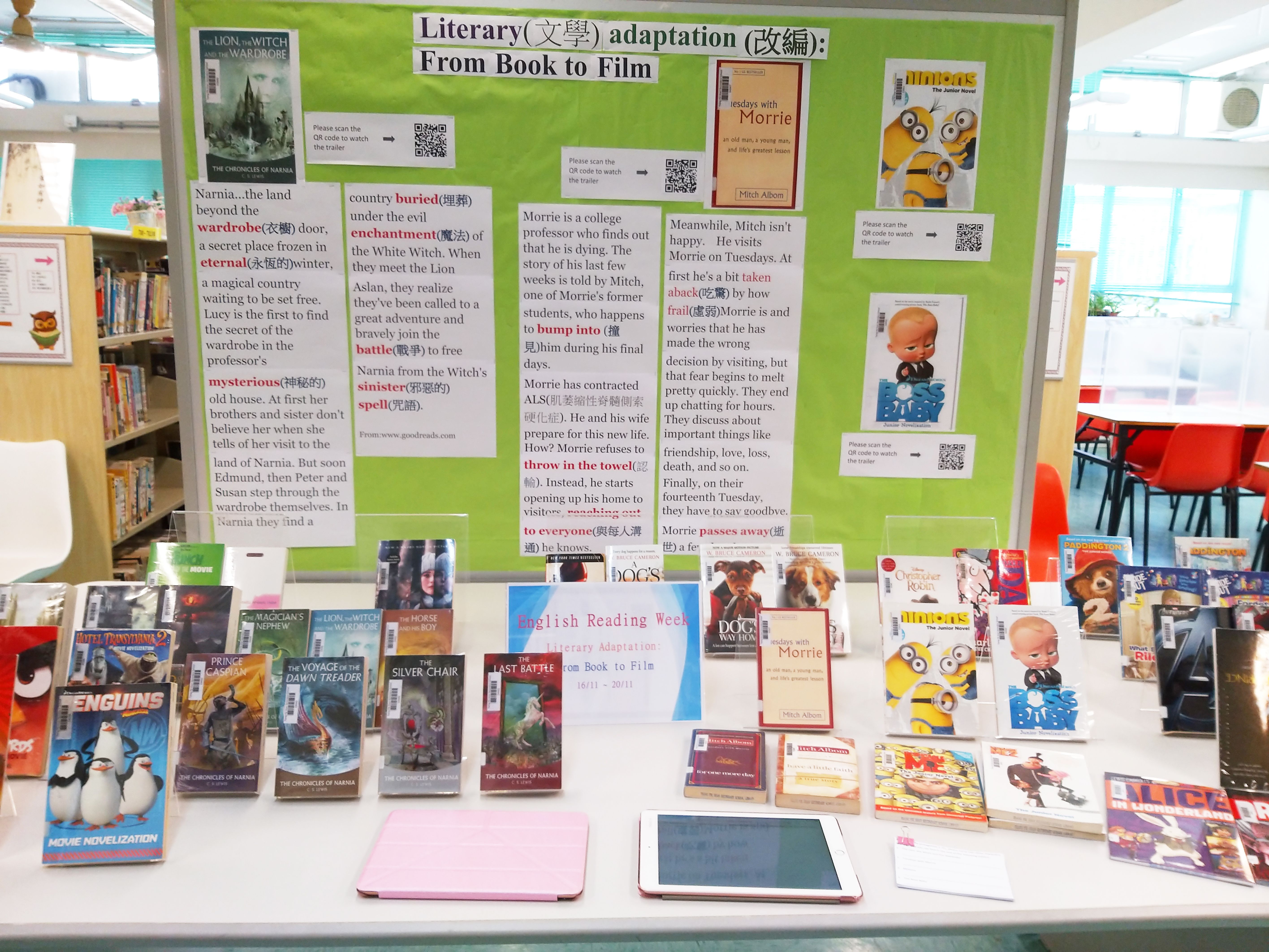The theme of the English Reading Week is literary adaptation: from book to film. Apart from the book display in the library, students can also scan the QR code with the ipads. Besides, they are always welcome to take part in the game and get the prizes in the library.