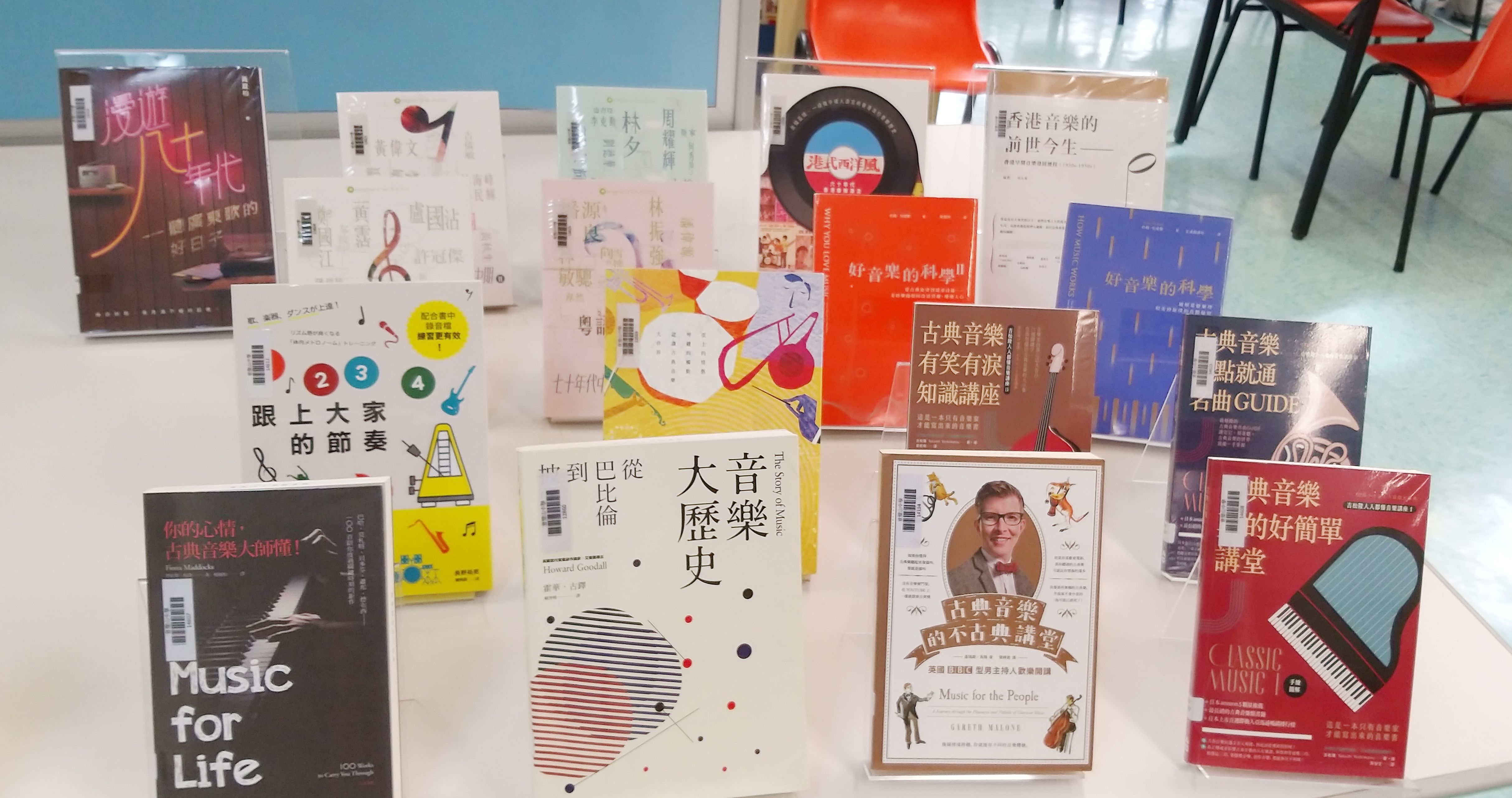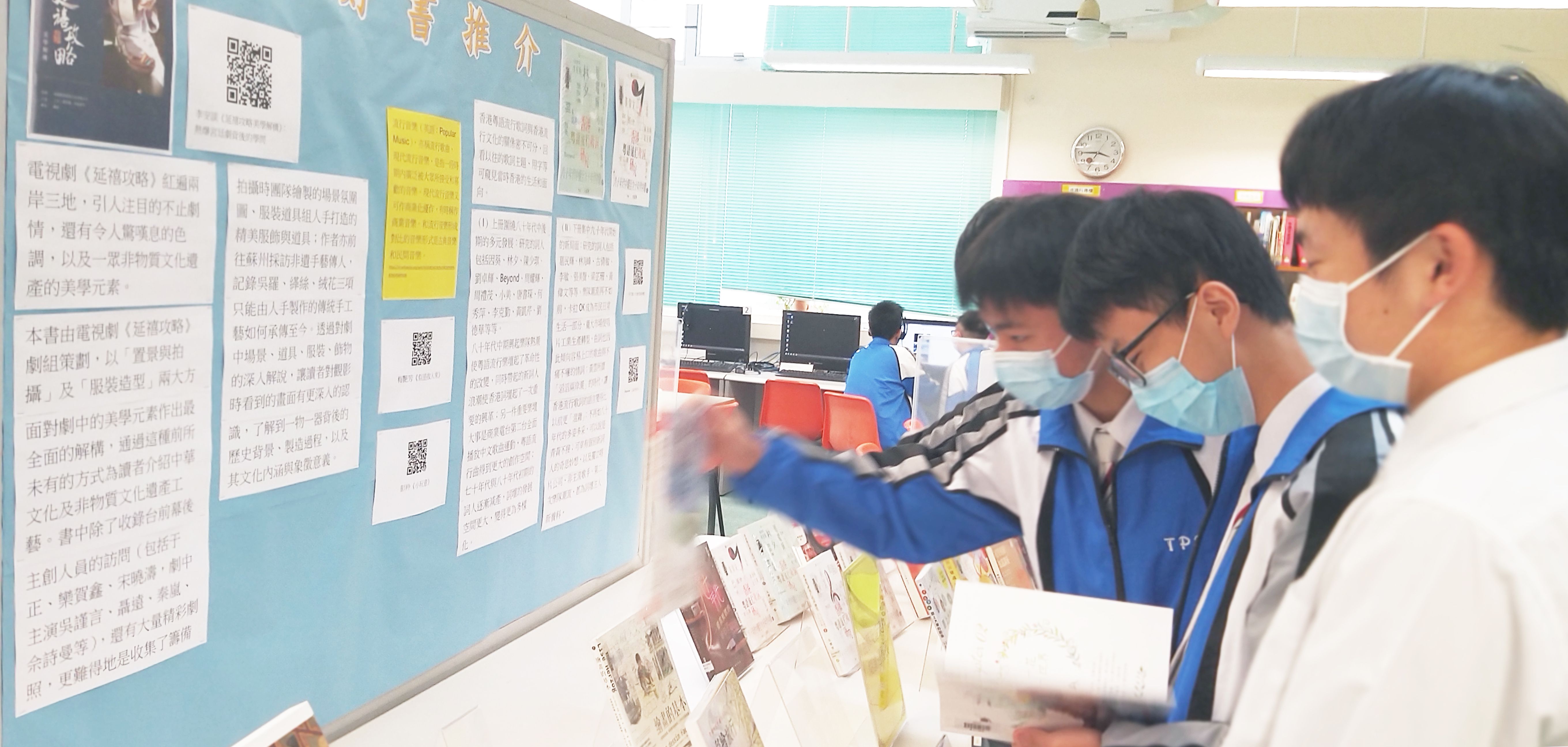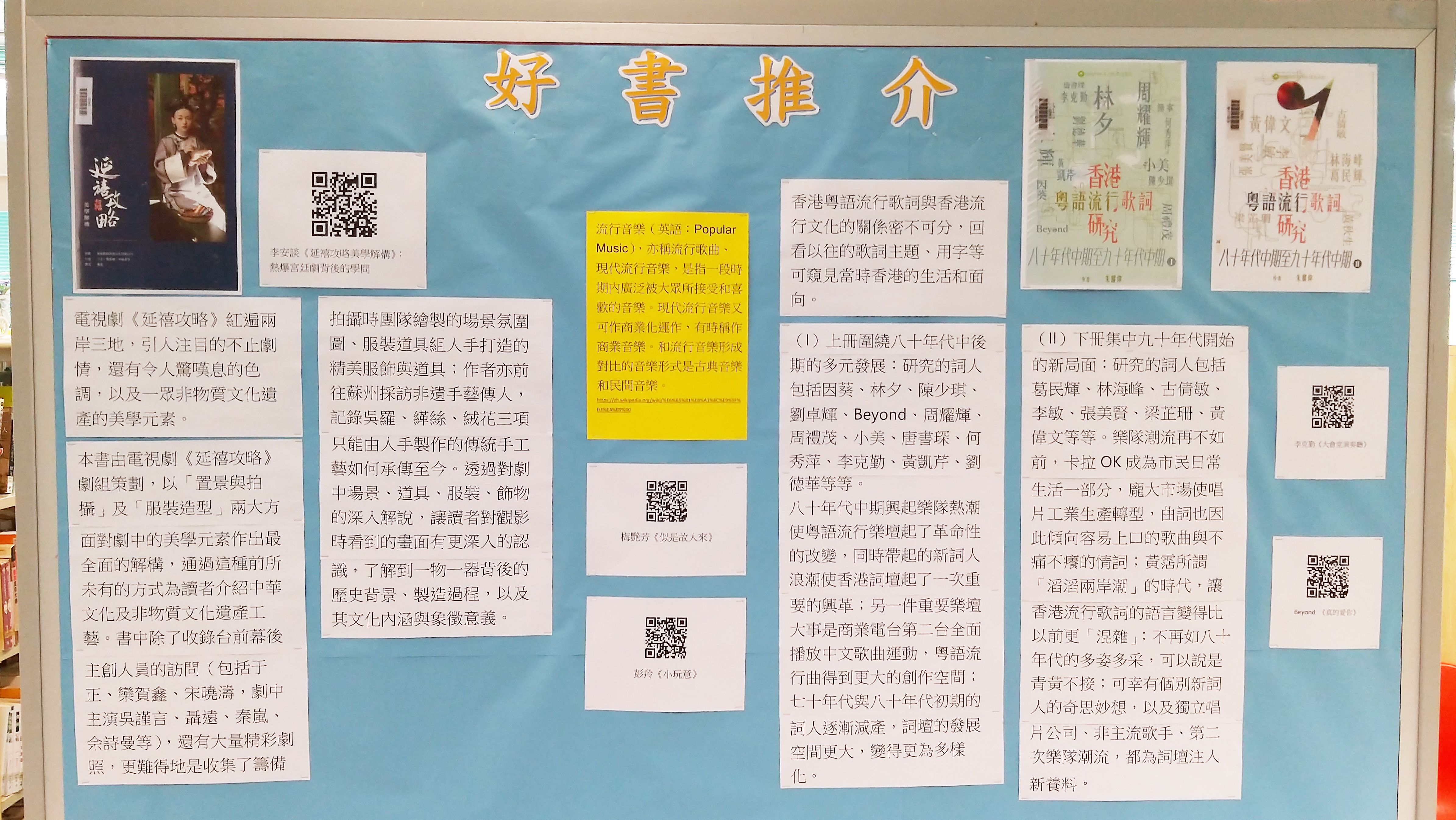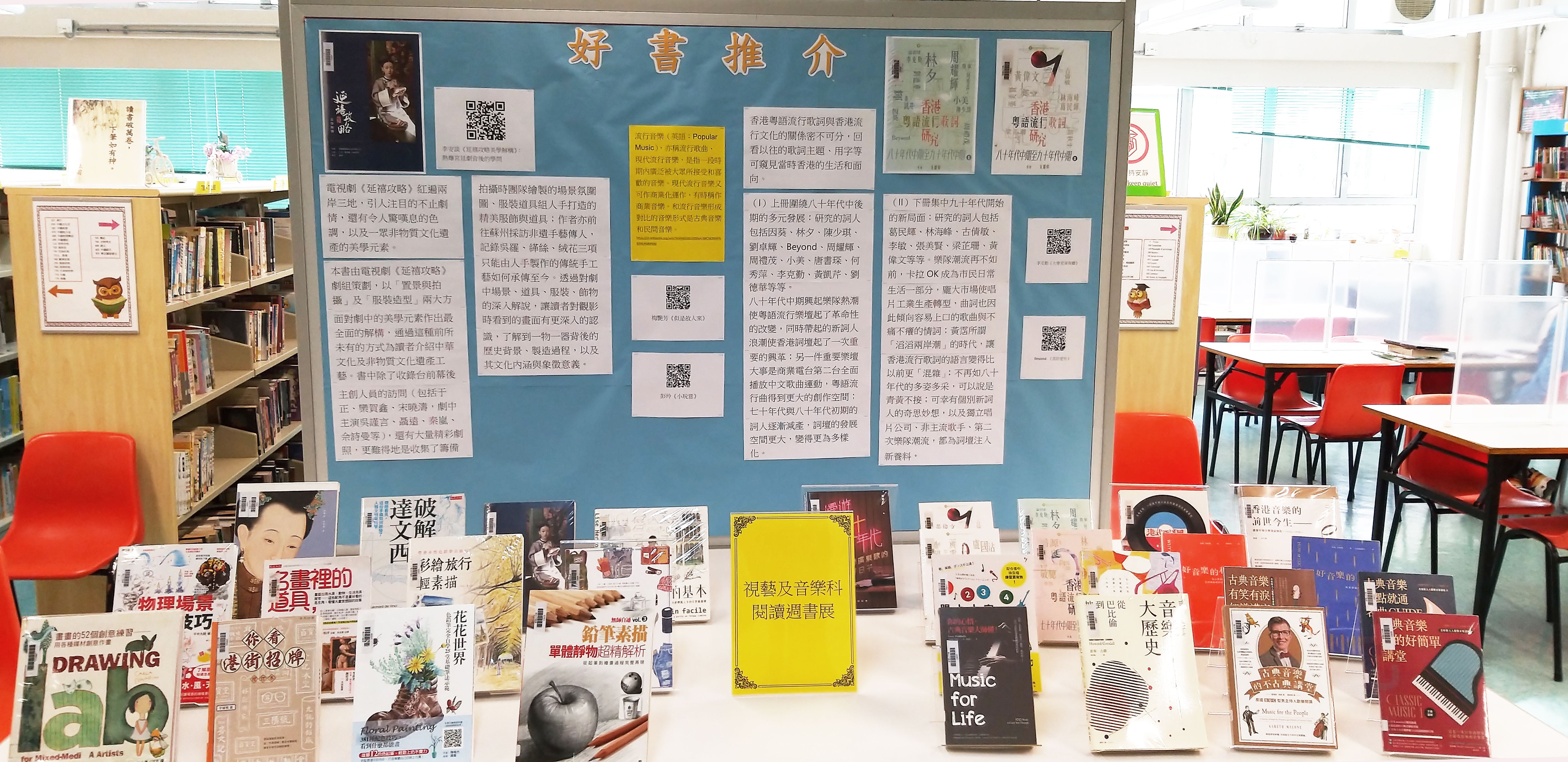 圖書館除了展出視藝及音樂科圖書外,還設置展板推介好書,亦附二維碼讓學生觀看相關圖書的網上影片資源。