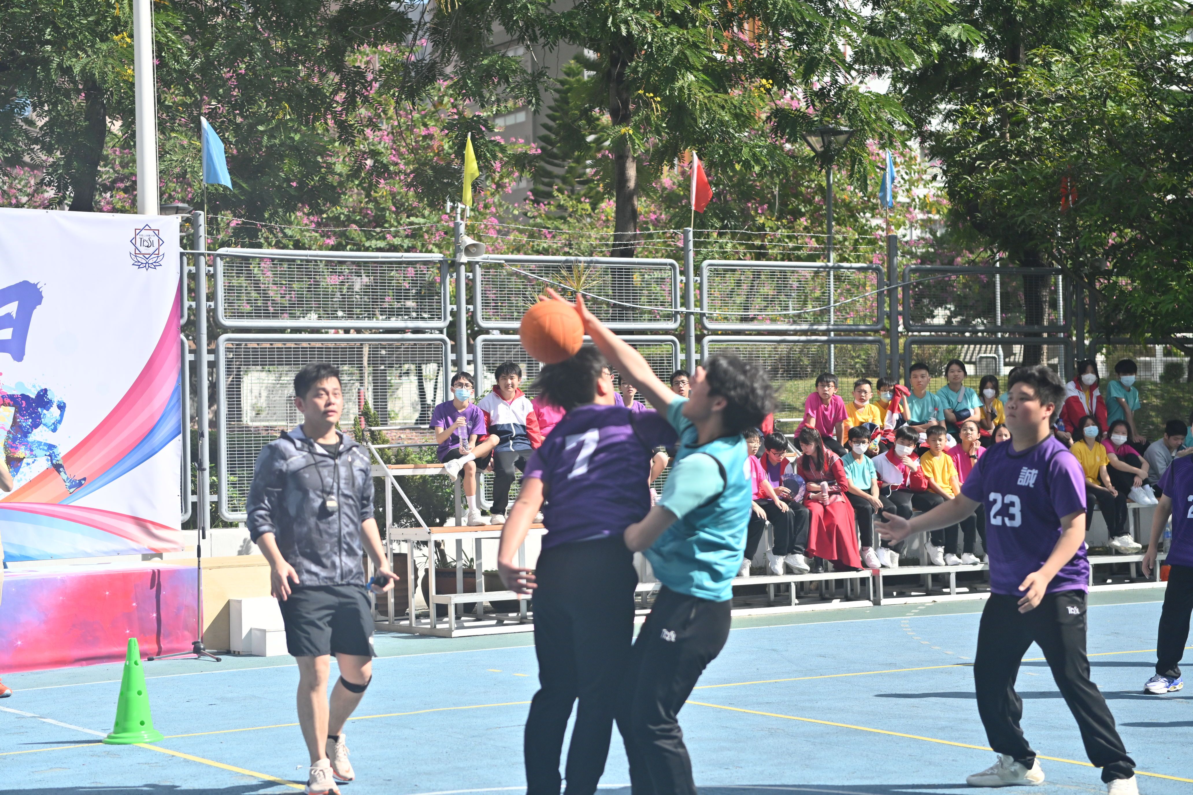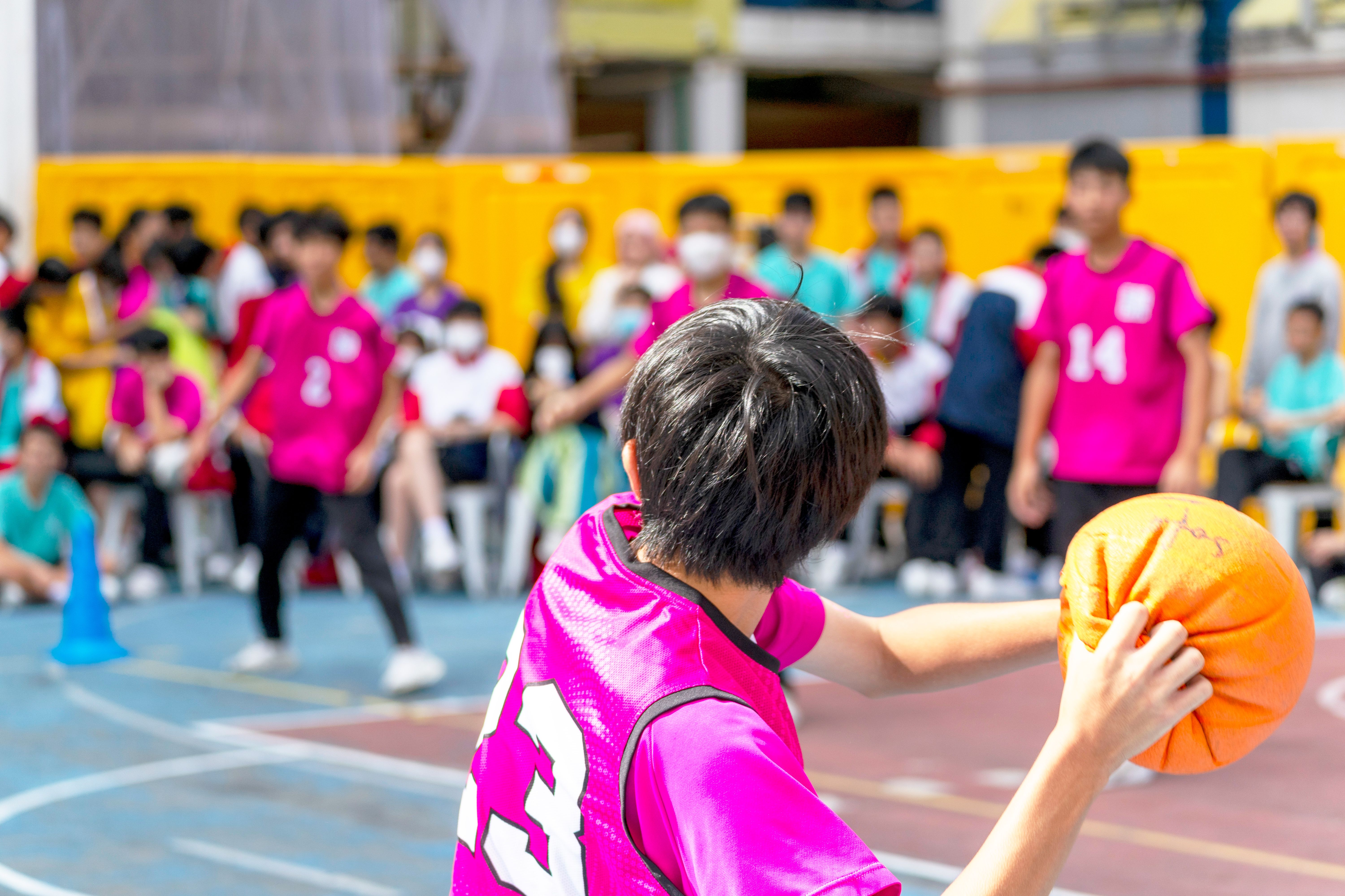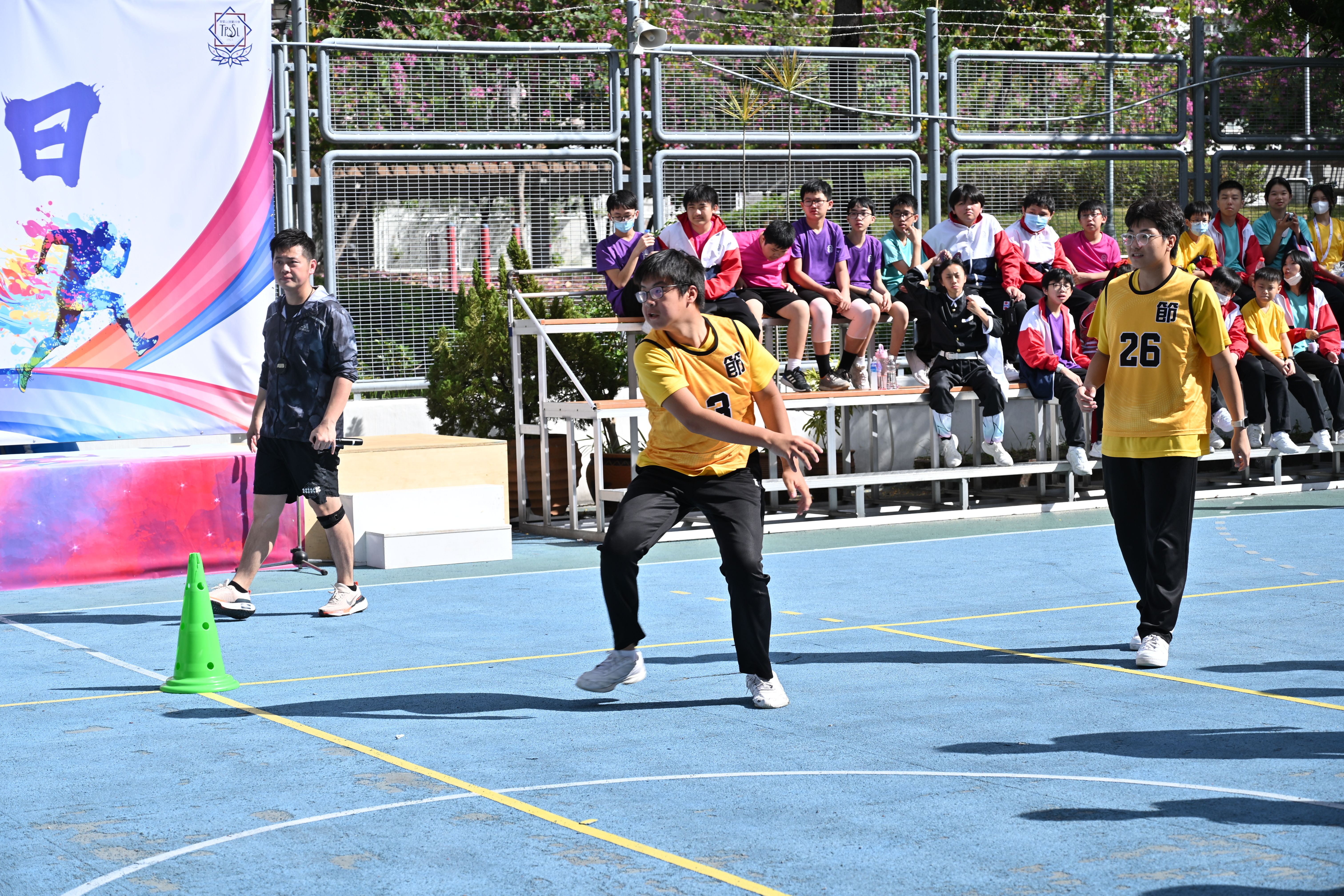 完成活力跑後,學生回校參加社際閃避球比賽,氣氛刺激緊張,不少同學都落力為自己的社員打氣。