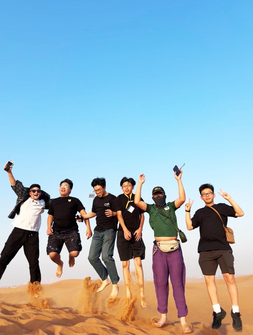 一眾師生在一望無際的沙漠中合照,背後是浩瀚的沙浪與蔚藍天空。
