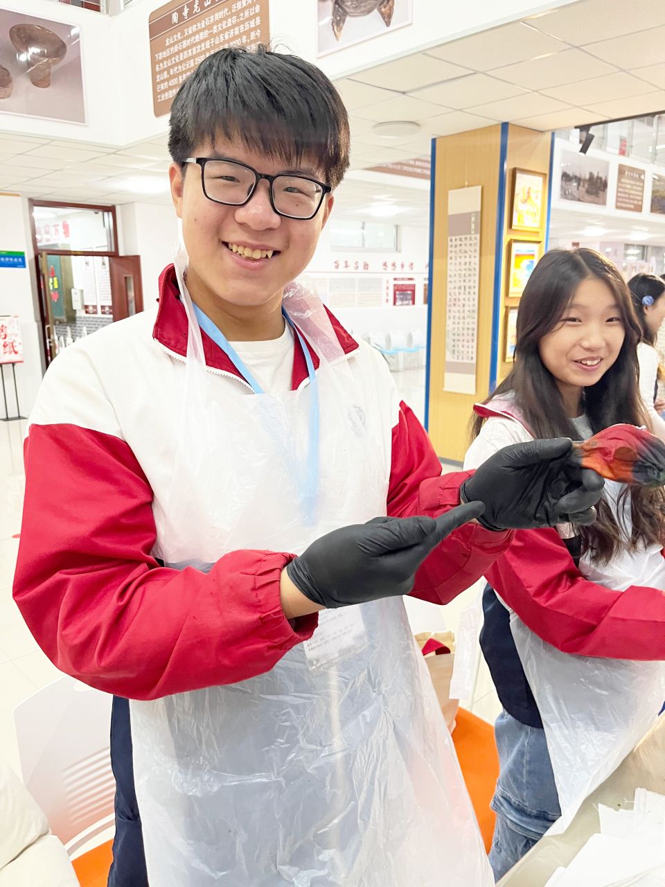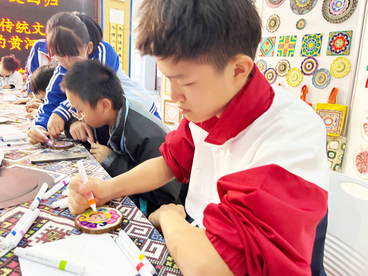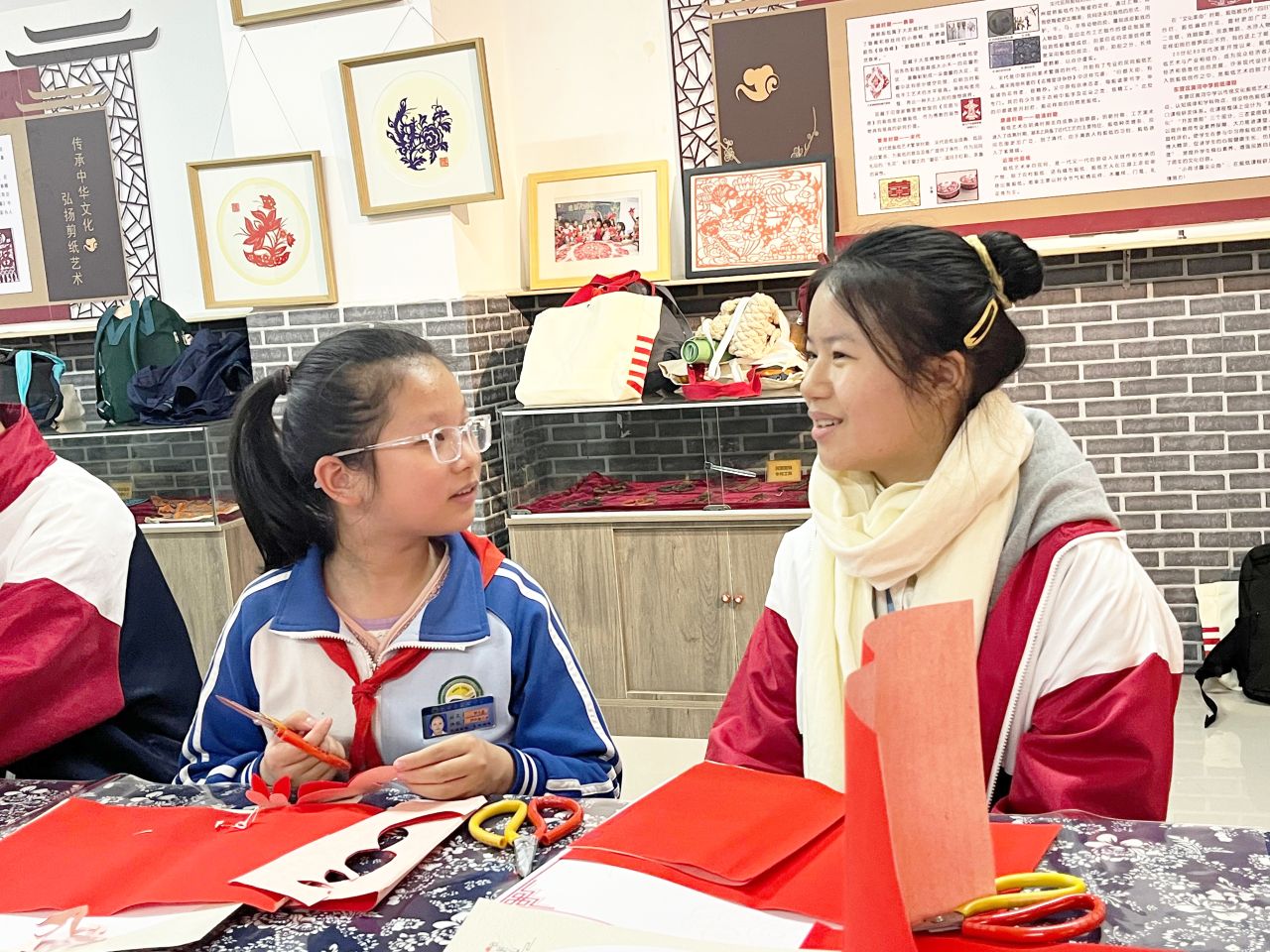3B班陳家樂同學於東營區黃河中學參與剪紙體驗課時與其學校學生交流。