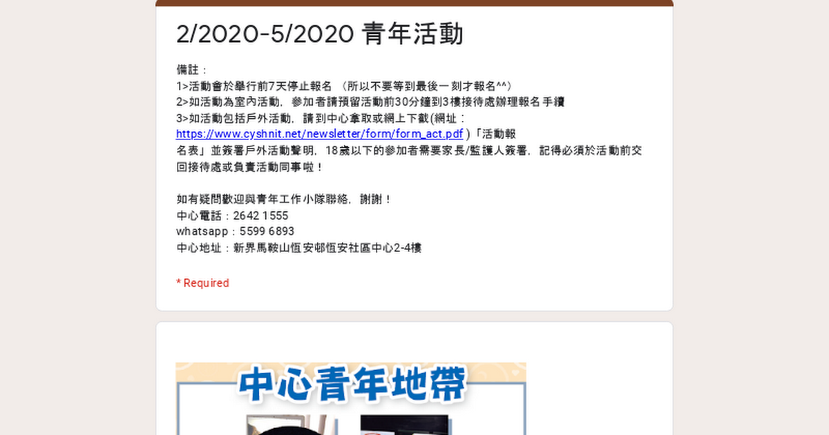 參加者請預留活動前30分鐘到3樓接待處辦理報名手續 3>如活動包括戶外活動,請到中心拿取或網上下截(網址︰htt ps://www.cyshnit.net/ )newsletter/form/form_act.pdf 「活動報 名表」並簽署戶外活動聲明,18歲以下的參加者需要家長/ 監護人簽署,記得必須於活動前交回接待處或負責活動同事啦! 如有疑問歡迎與青年工作小隊聯絡,謝謝! 中心電話:2642 1555