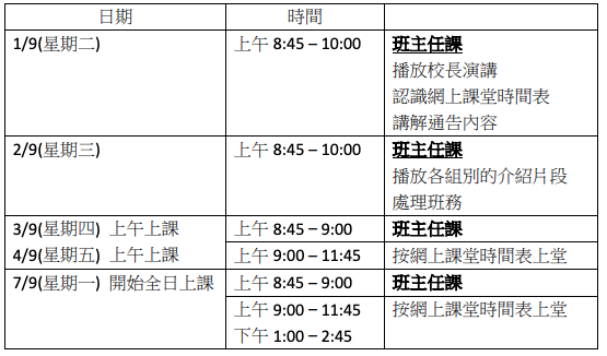 2. 首星期上課時間 由於疫情影響,暫時未能復課。學校將安排老師每天定時網上授課[ZOOM],所有學生必須依時出席所有安排的網上學習。